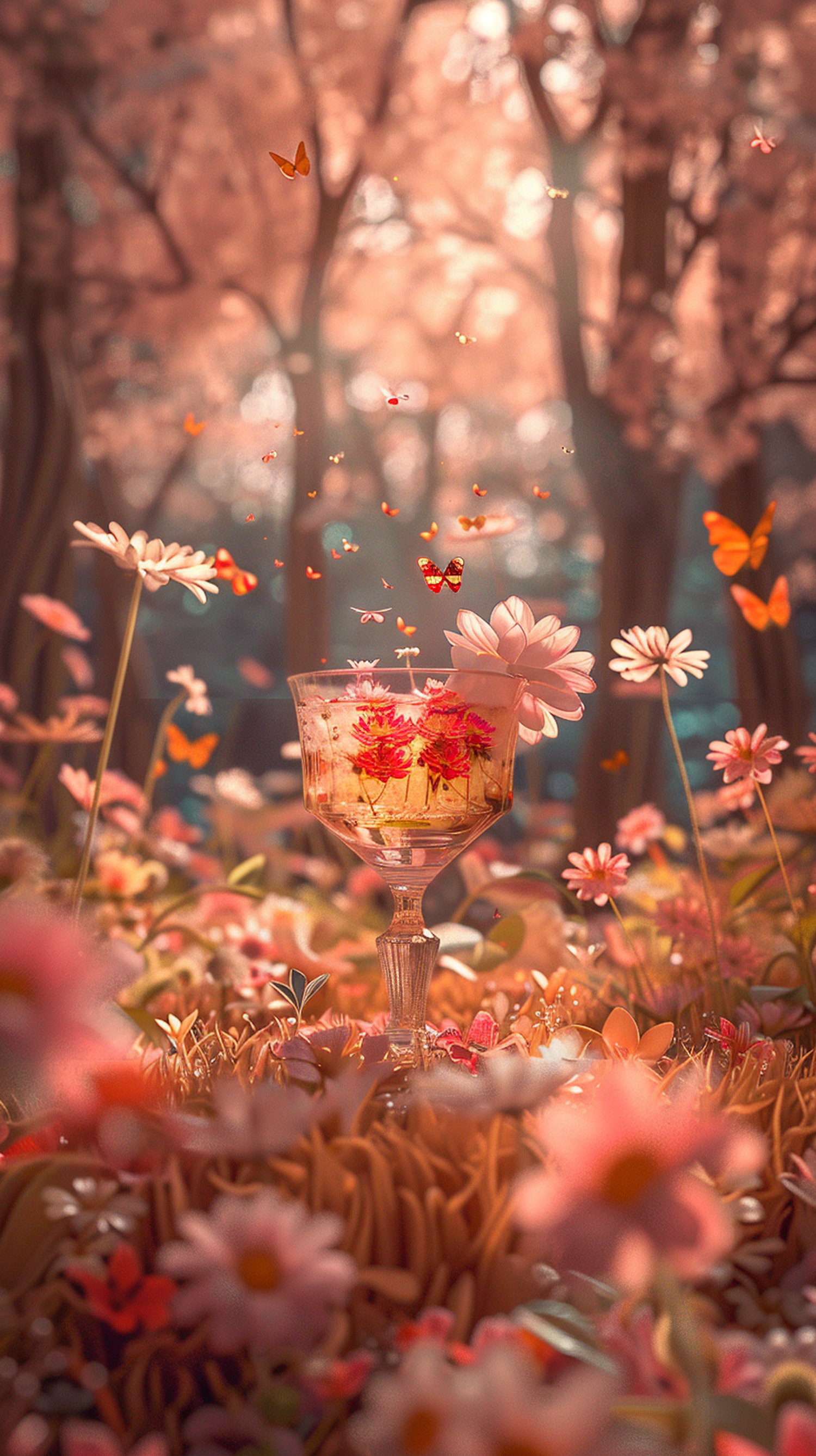 Enchanting forest scene with a glass goblet, vibrant flowers, and fluttering butterflies in warm, dreamy light.