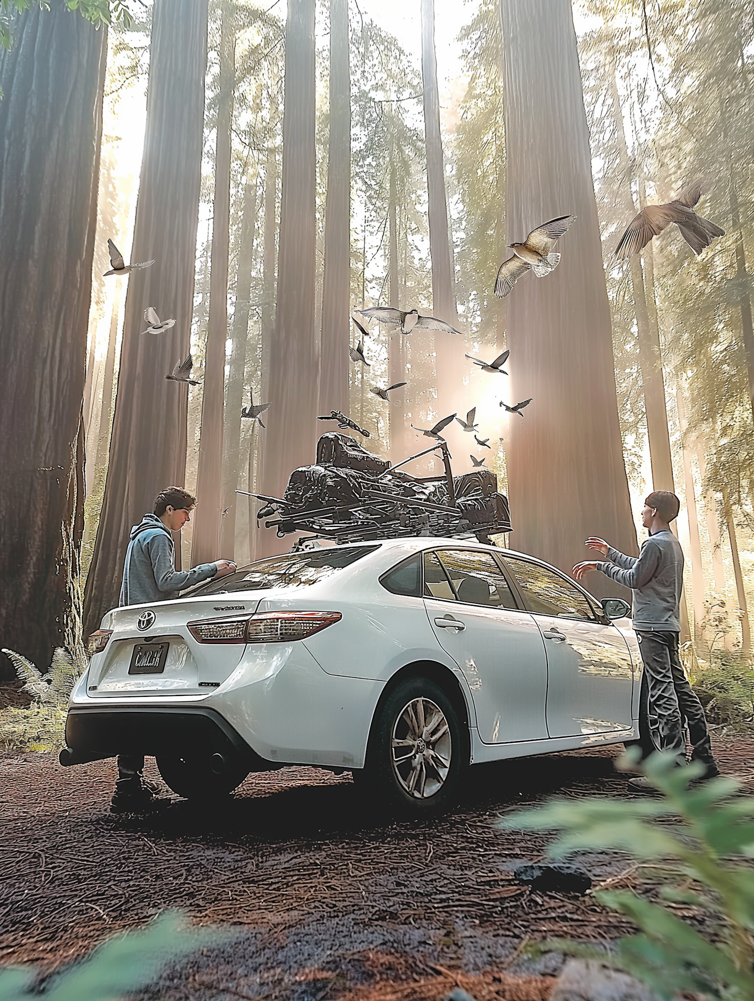 Two men with a white Toyota in a sunlit forest, surrounded by birds and tall trees, creating a serene and adventurous scene.