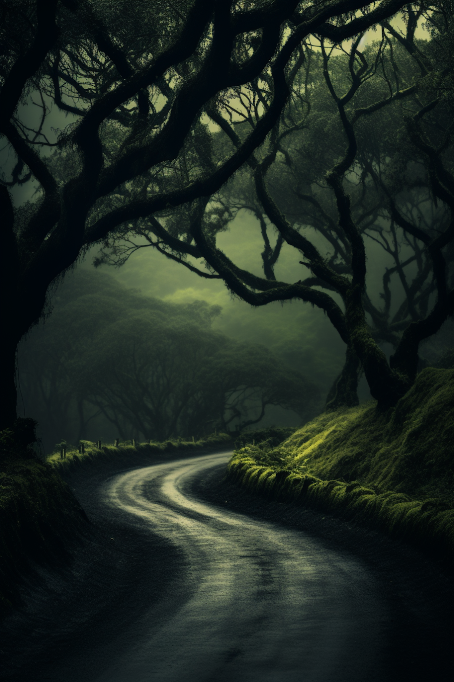 A winding road through a misty, lush forest with twisted trees and moss-covered ground, creating an enchanting and mysterious atmosphere.