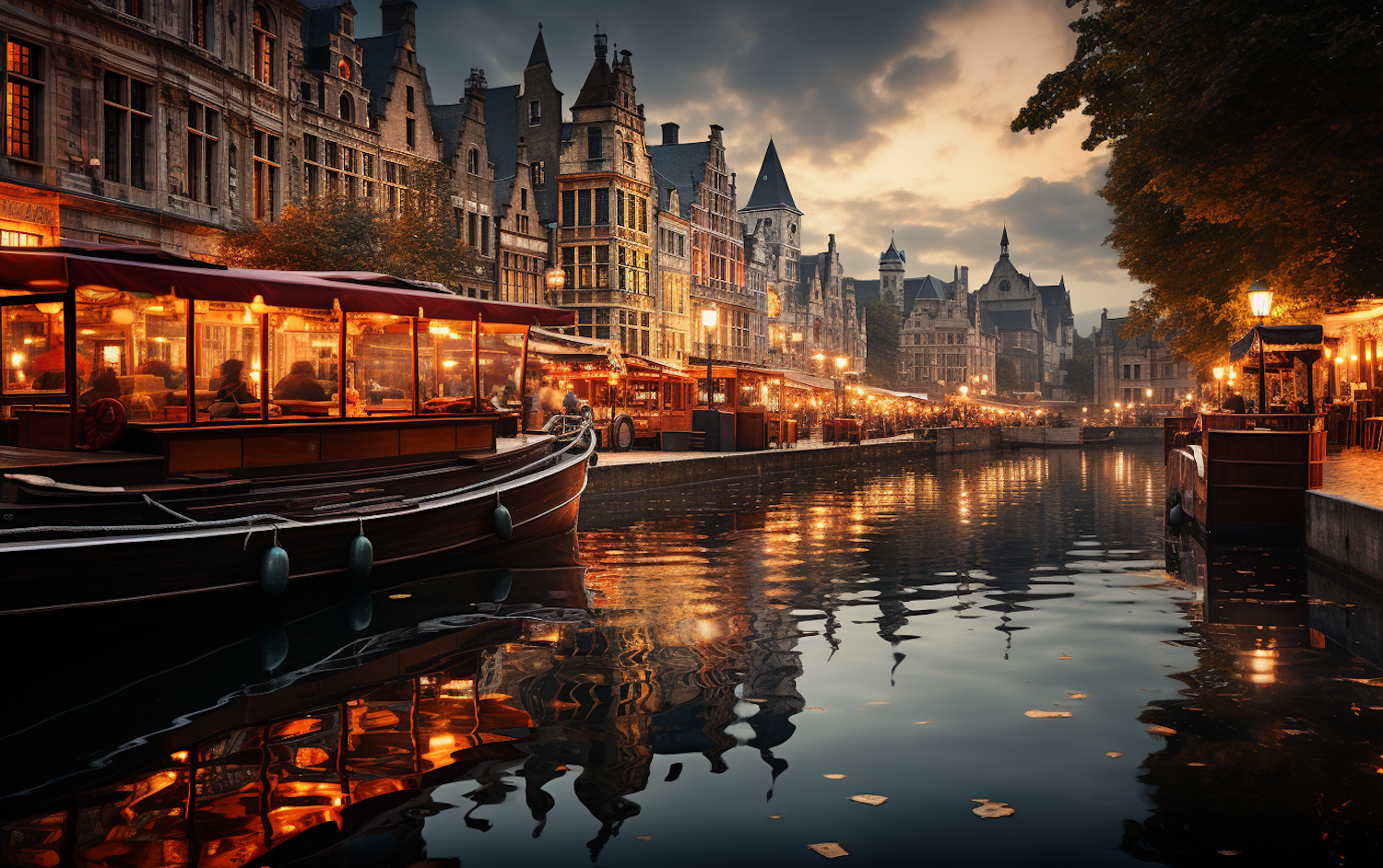 Charming canal scene at dusk with glowing lights, historic buildings, and a cozy boat reflecting on the water.