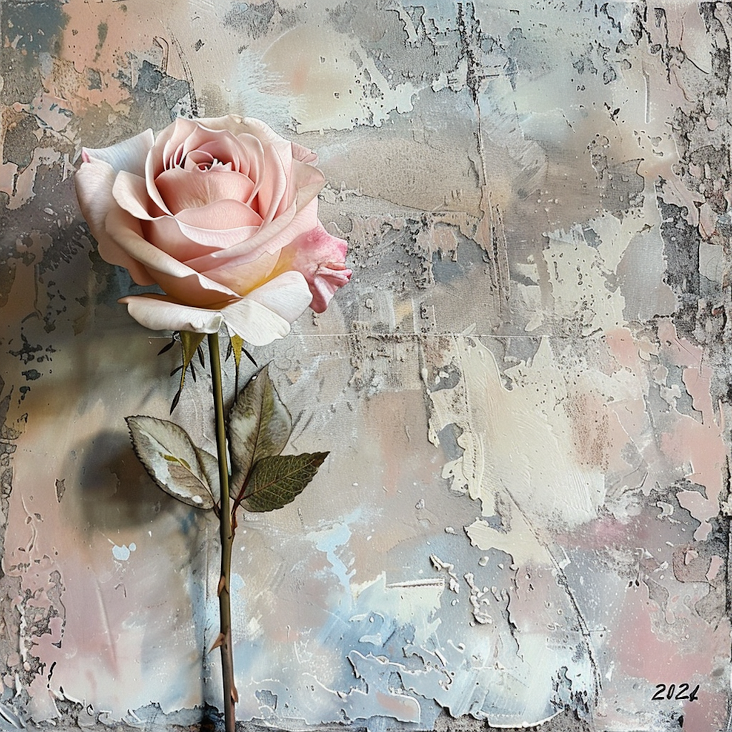 A beautiful pink rose against a textured, abstract background with muted colors and artistic flair. Year '2021' inscribed.