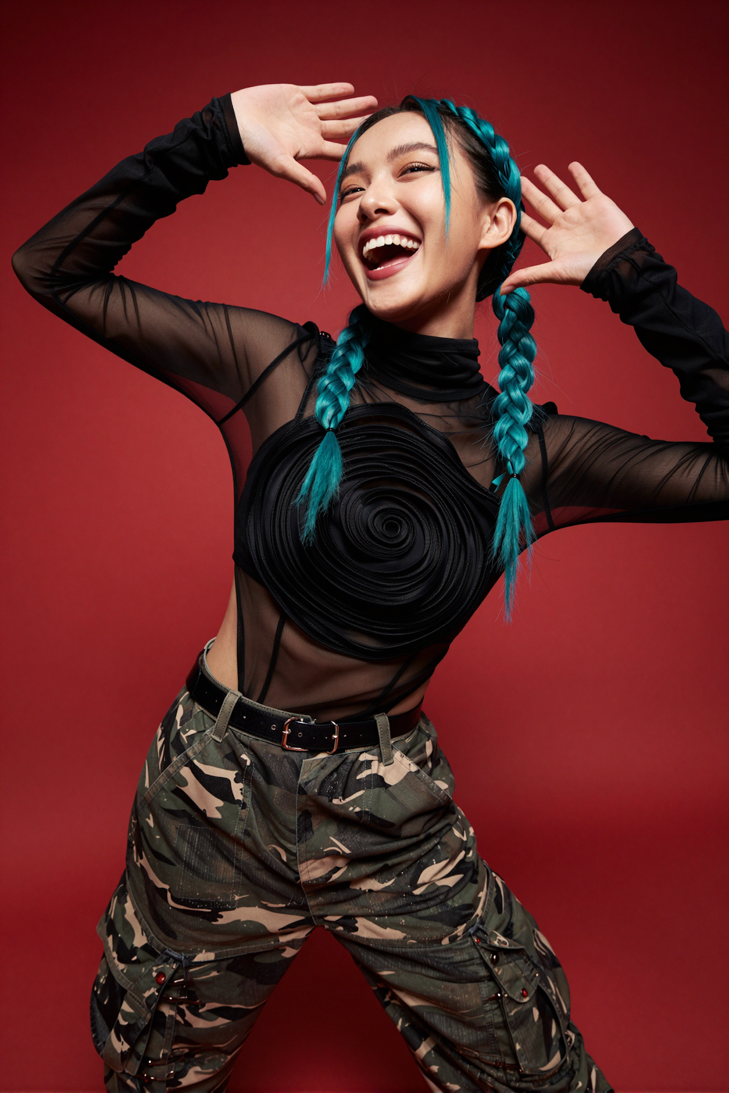 A vibrant portrait of a woman with blue braids, a black sheer top, and camo pants, posing joyfully against a red background.