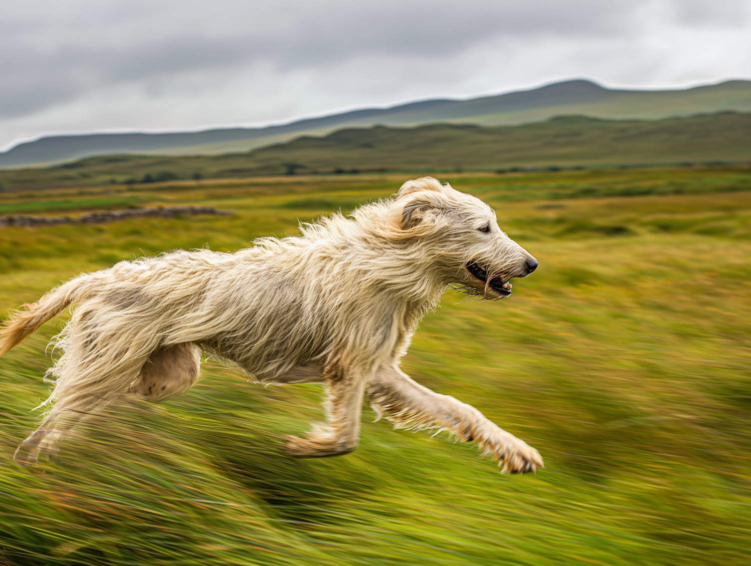 Shaggy cream-colored dog running energetically across a lush green field with rolling hills in the background.