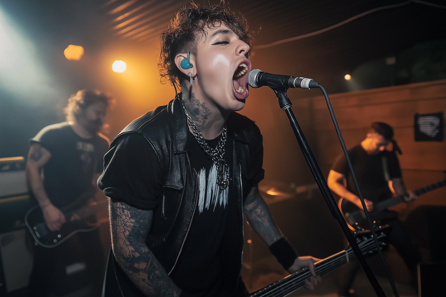 Energetic live band performance with a tattooed singer in a leather vest, vibrant stage lighting, and passionate expressions.