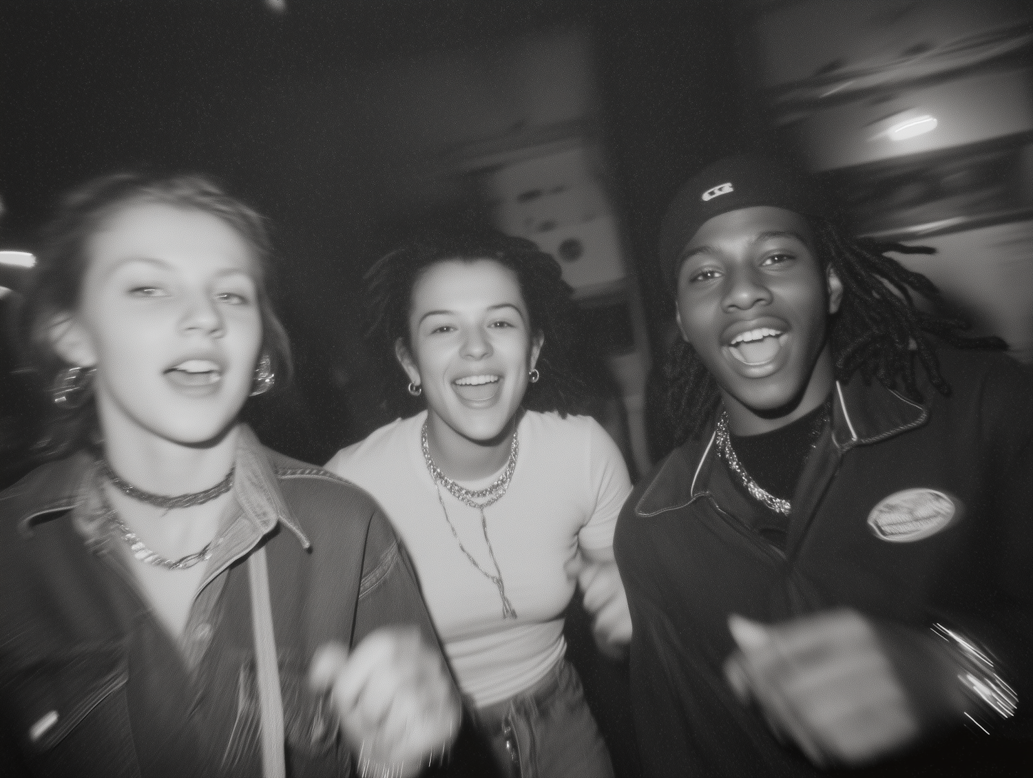 Black-and-white photo of three friends laughing and moving energetically, dressed casually with layered necklaces and a lively vibe.