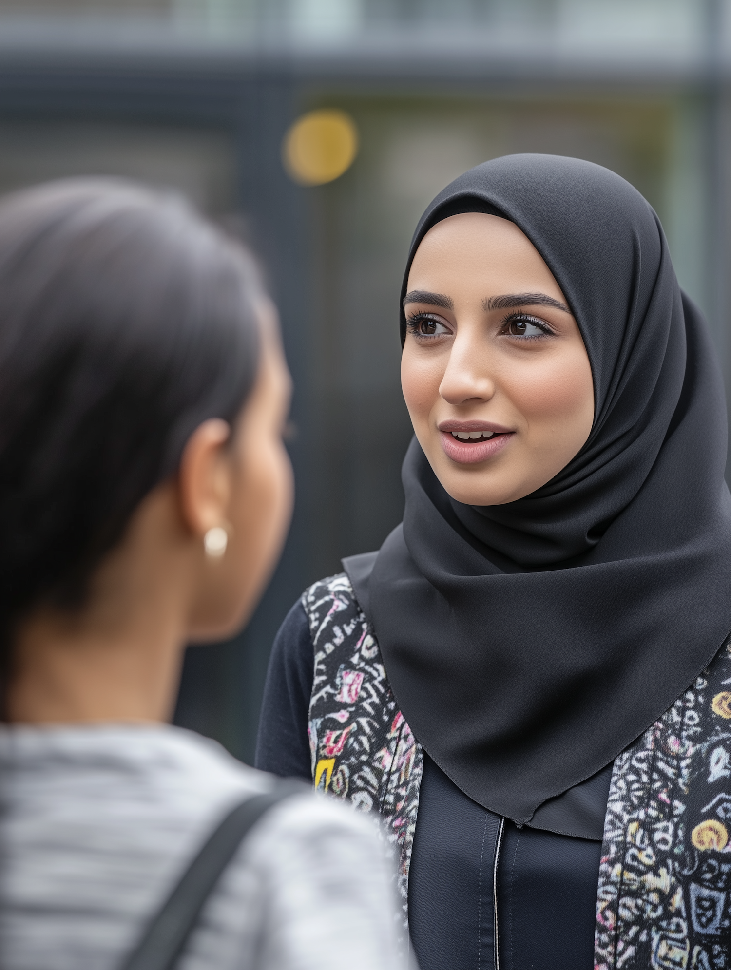 Two women in conversation, one wearing a black hijab and patterned vest, outdoors in an urban setting.