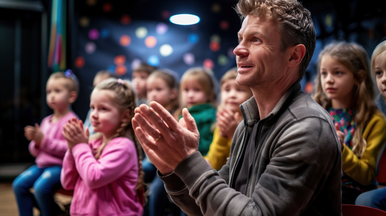 A man and children clapping in an audience, enjoying a lively event with colorful lights in the background.