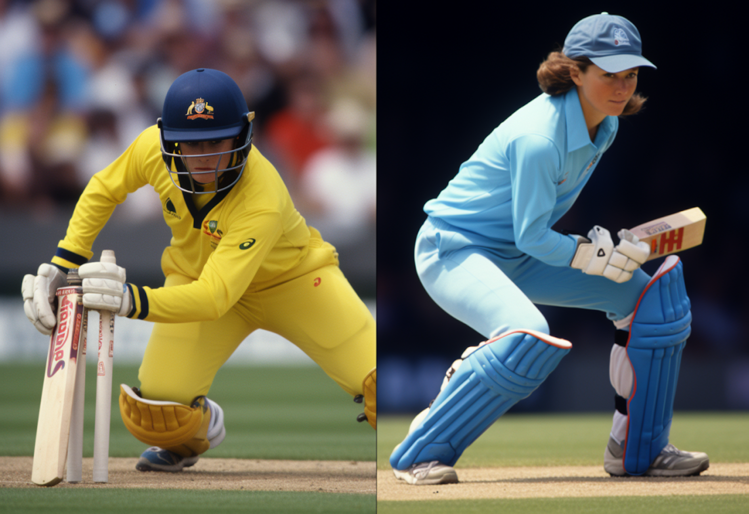 Two cricket players in action, one in yellow and the other in blue, both focused and ready on the field.