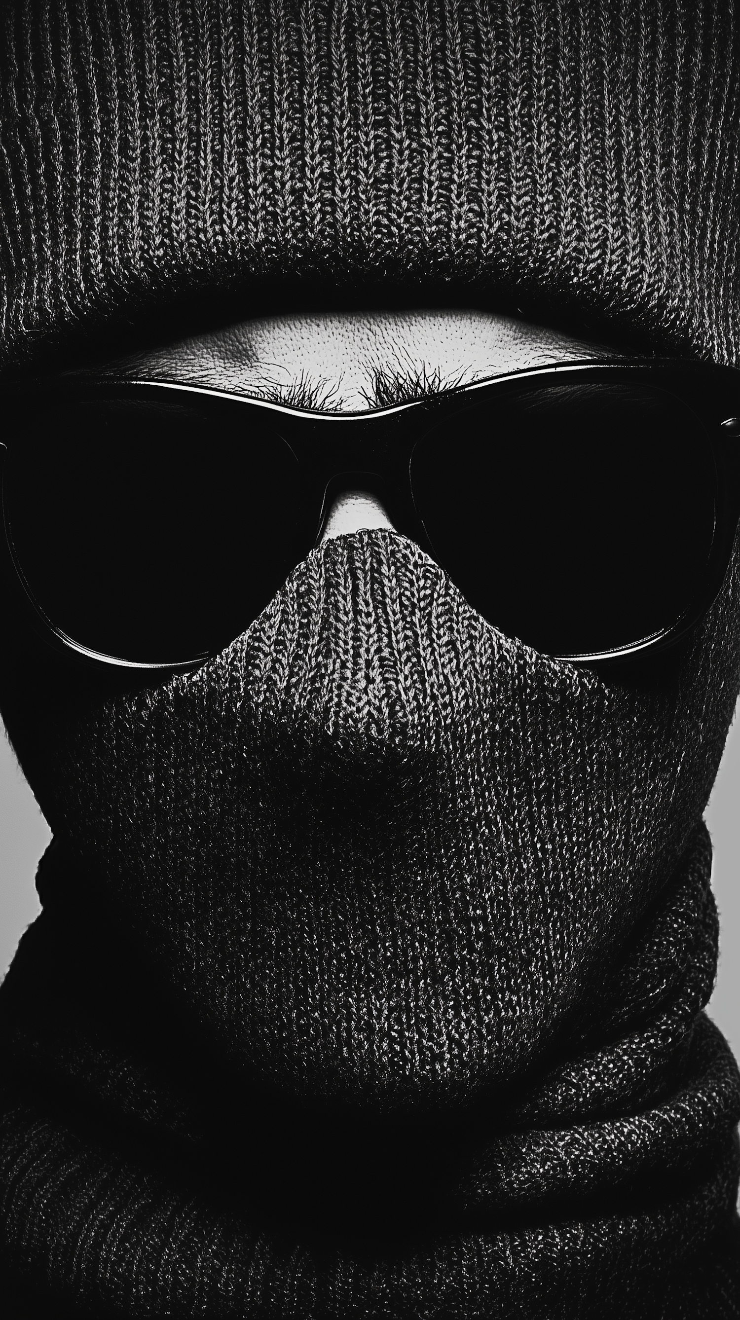 Mysterious figure in dark knitwear and sunglasses, face obscured, creating an enigmatic and dramatic visual effect.