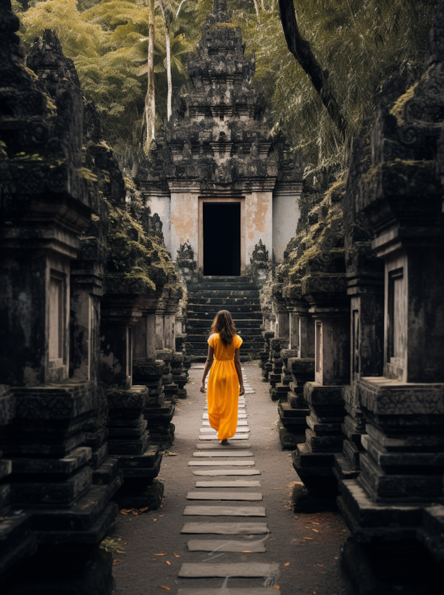 Woman in a yellow dress walking through an ancient moss-covered temple pathway, surrounded by intricate stone carvings and lush greenery.