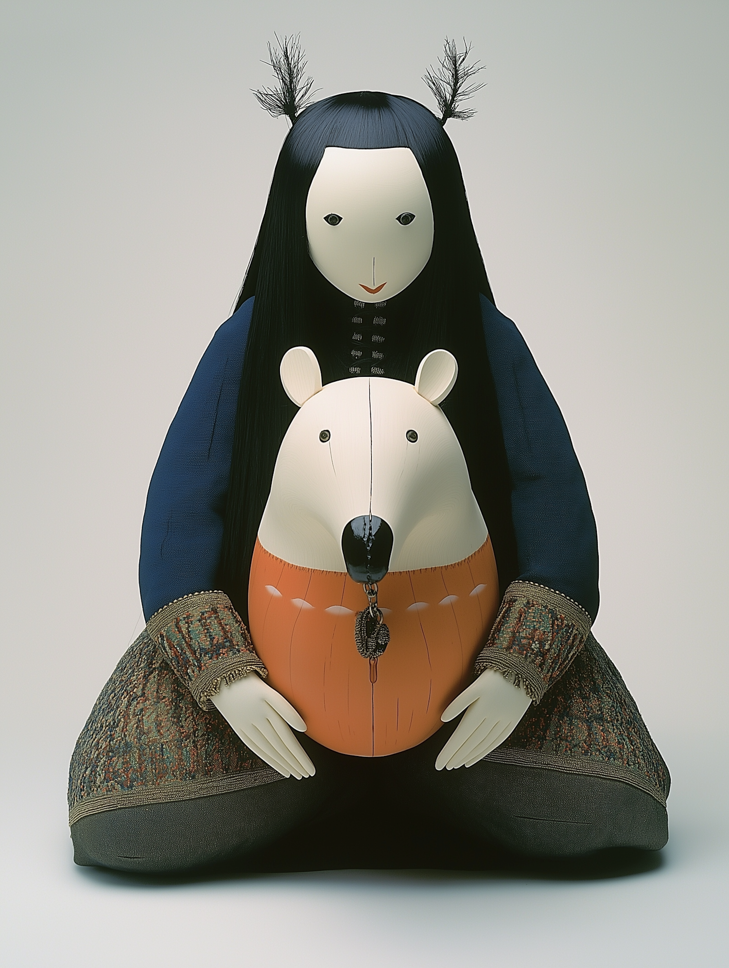 Stylized figure with long black hair holds a bear-like figure, wearing a dark blue garment with intricate patterns.