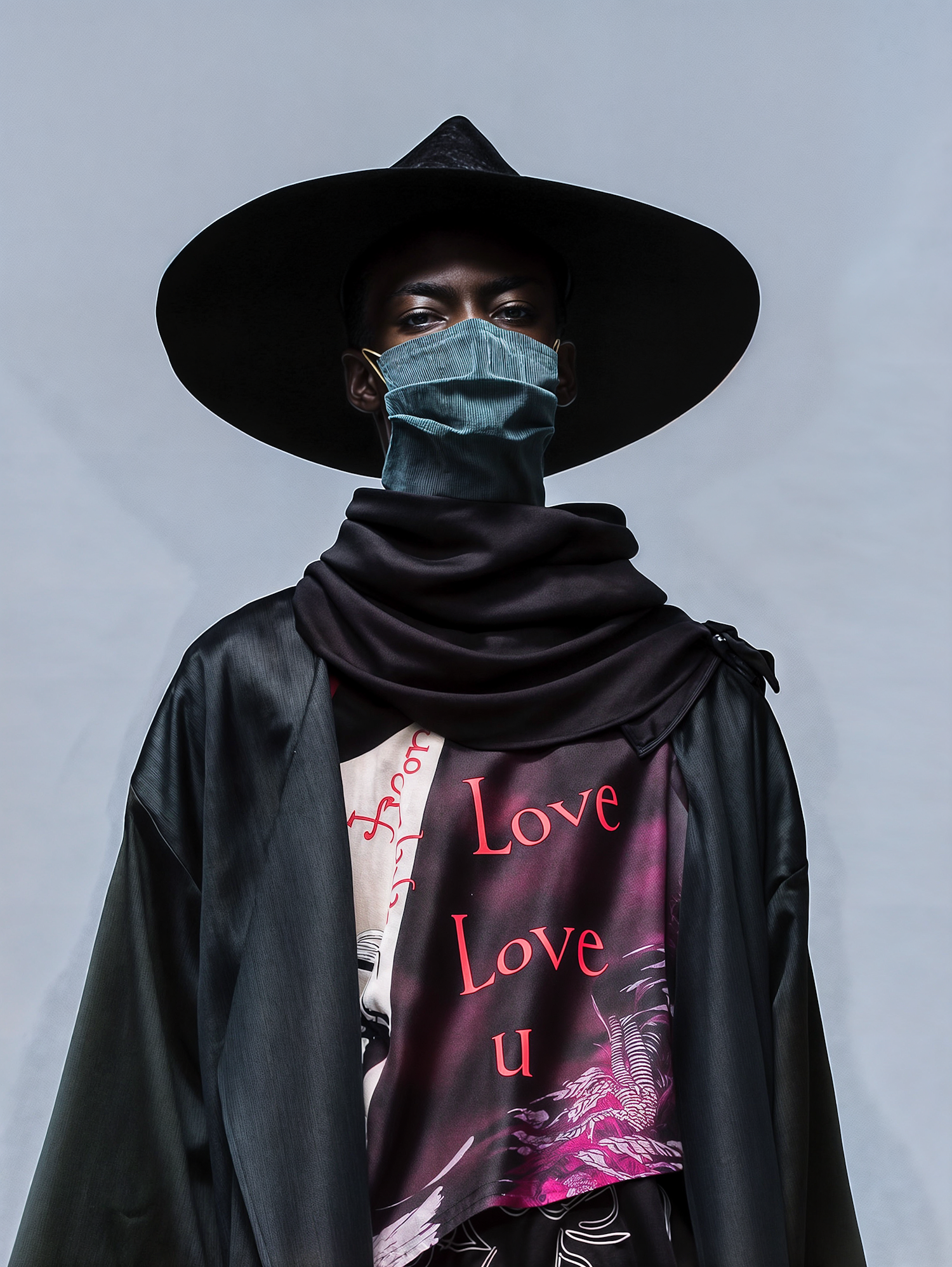 Fashion-forward individual in a wide-brimmed hat, teal mask, and 'Love Love u' shirt, exuding mystery and style.