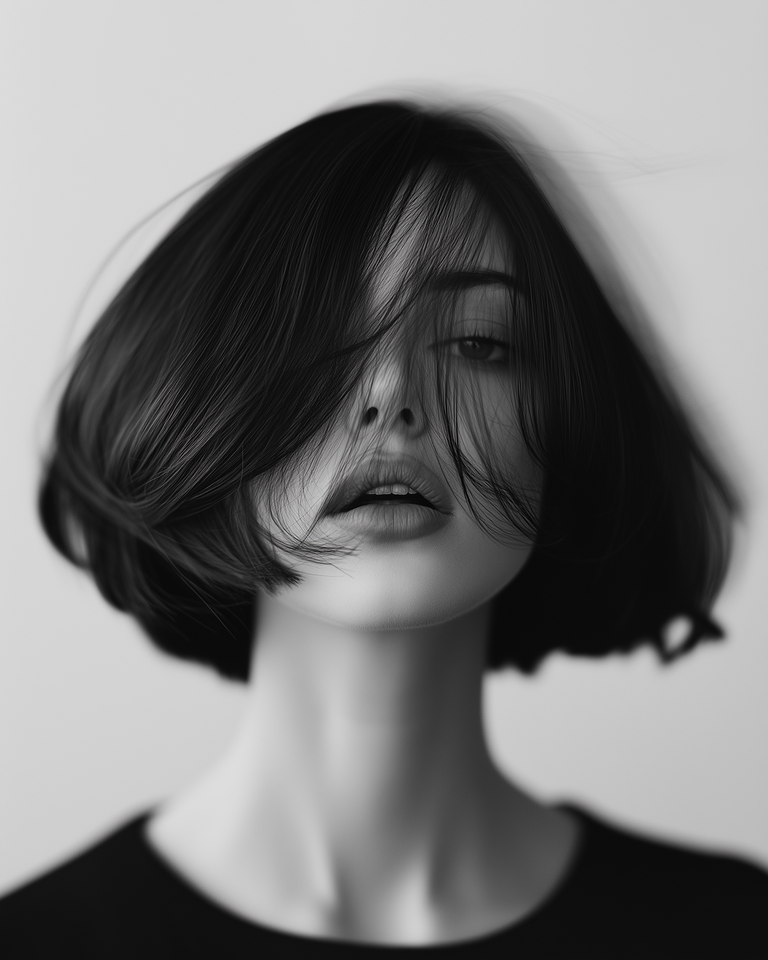 Monochrome portrait of a woman with a bob haircut, dark hair partially covering her face, and a soft expression.