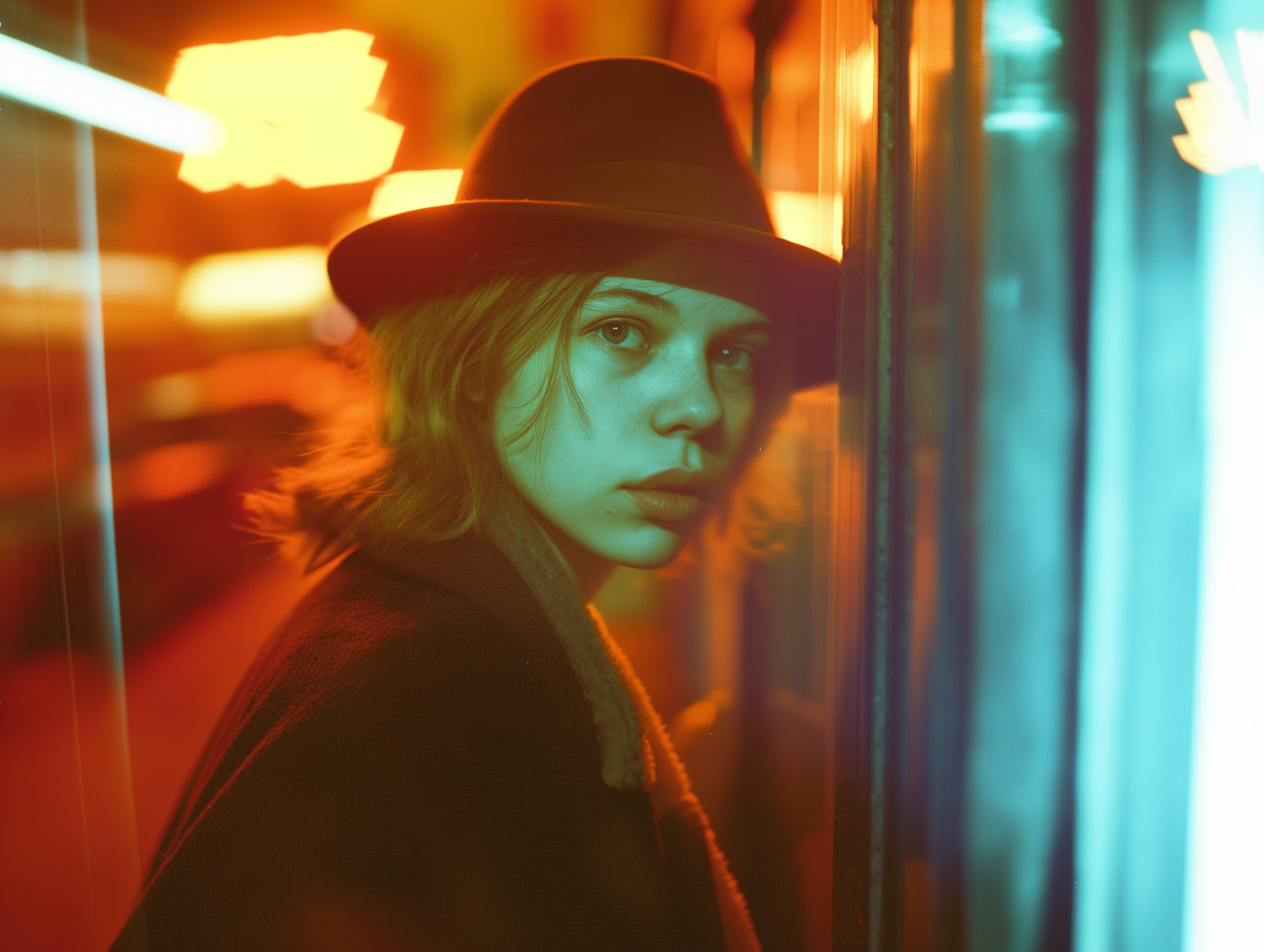 Moody portrait of a young woman in a fedora, with dramatic orange and blue lighting, creating a reflective and contemplative atmosphere.