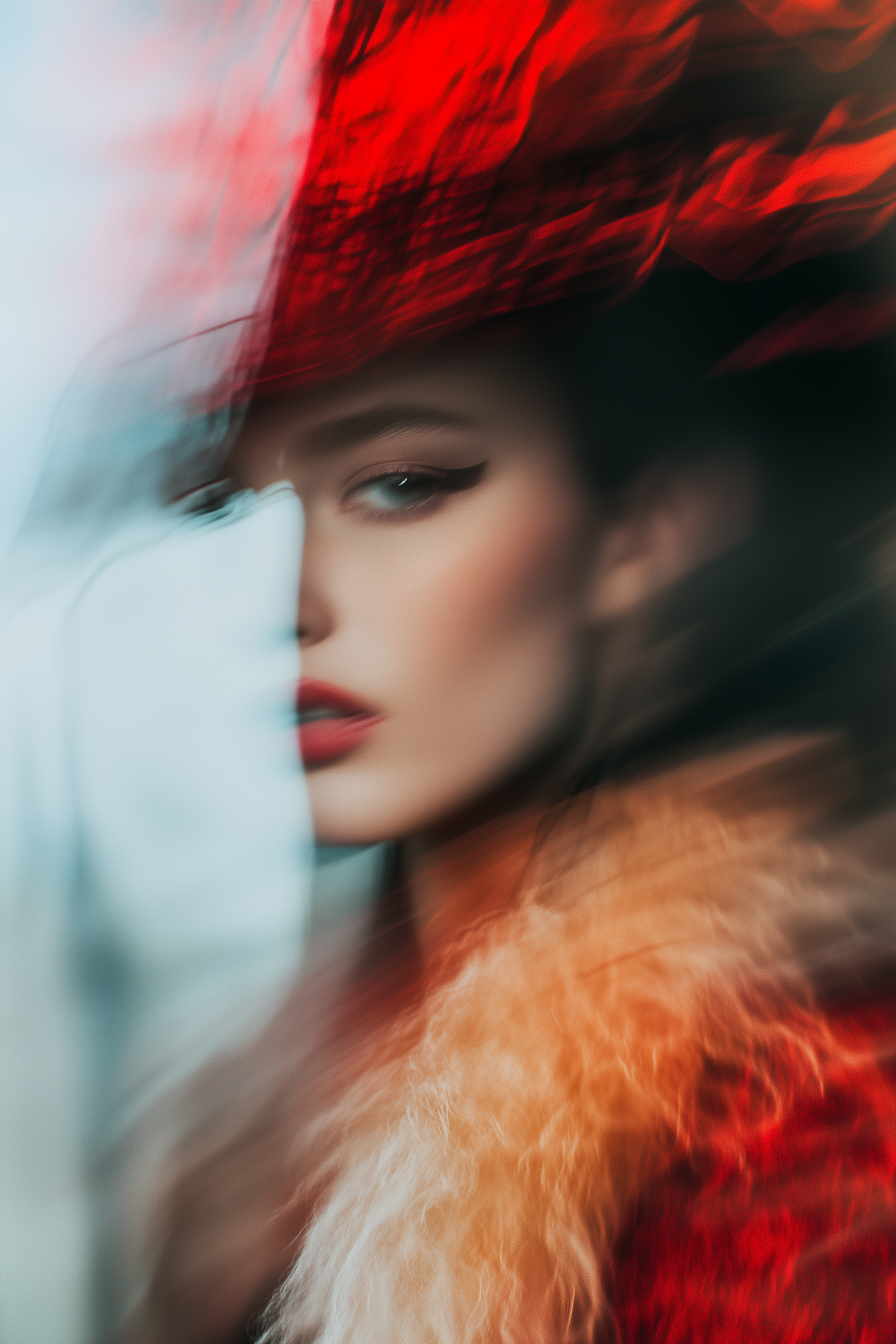 Artistic portrait of a woman in a red hat and fur coat, with a blurred, dreamlike effect highlighting her eye and bold colors.