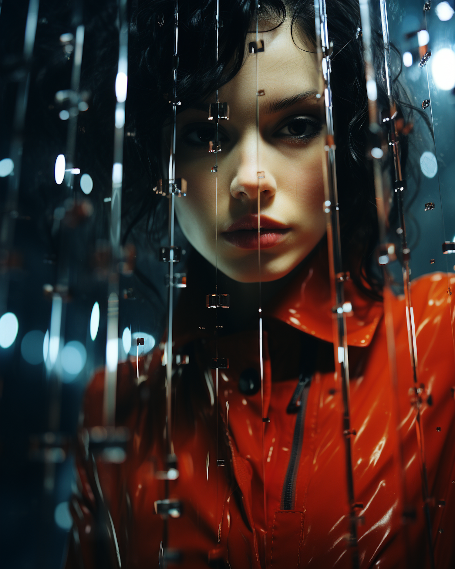 A woman in a red raincoat stands behind glass beads, creating a mysterious and reflective atmosphere.