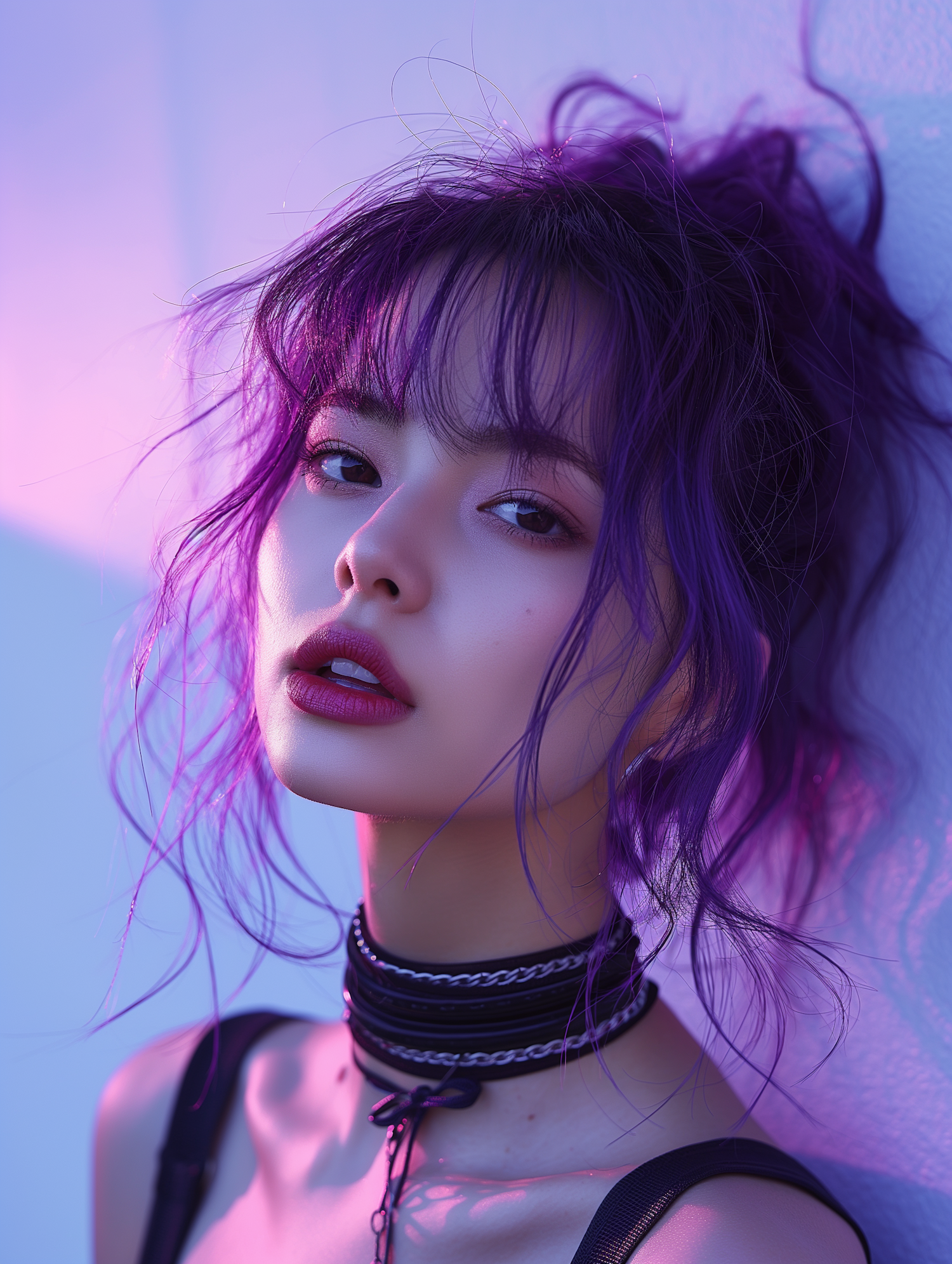 Asian woman with purple hair and a black choker, bathed in pink and purple lighting, exudes a modern and edgy style.