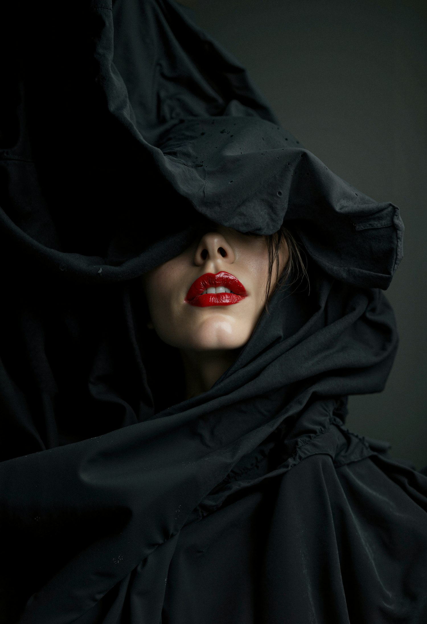 Mysterious portrait with bold red lips and black draped fabric, creating a dramatic and artistic contrast.