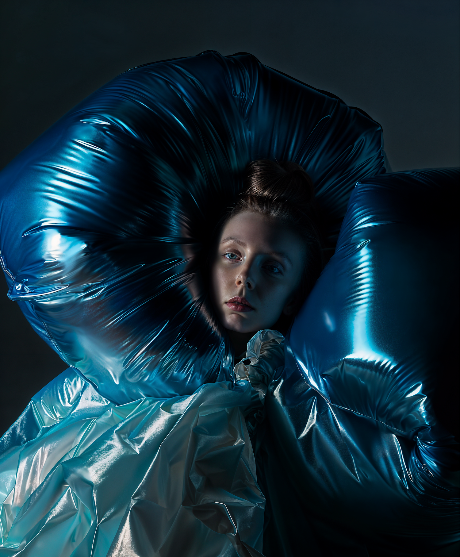 Avant-garde portrait of a woman framed by metallic blue inflatable material, with dramatic lighting and a futuristic aesthetic.