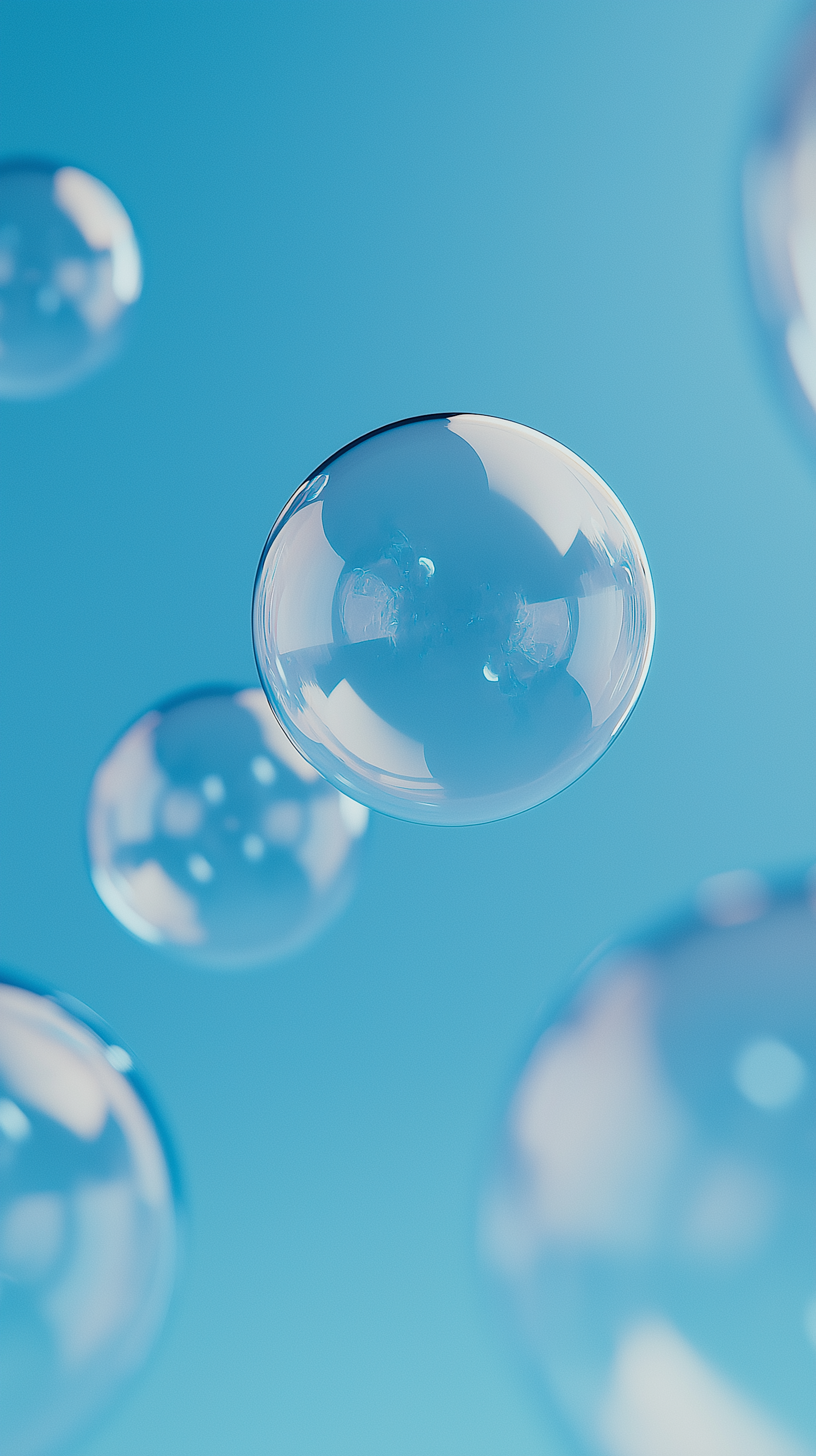Close-up of translucent soap bubbles floating against a bright blue background, reflecting light and creating a serene, airy vibe.