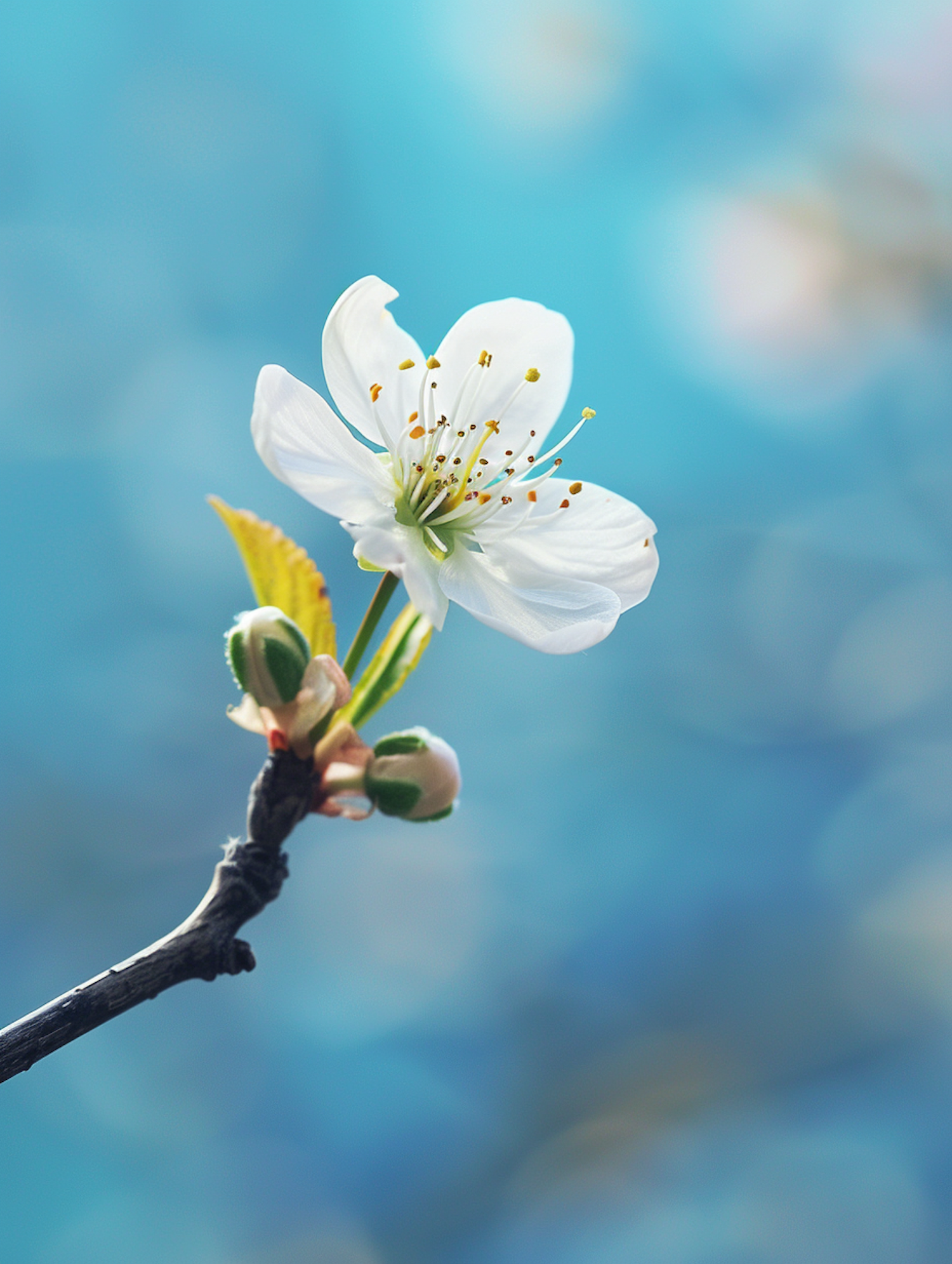 Close-up of a white flower with yellow stamens on a branch, set against a soft blue background, highlighting its delicate beauty.