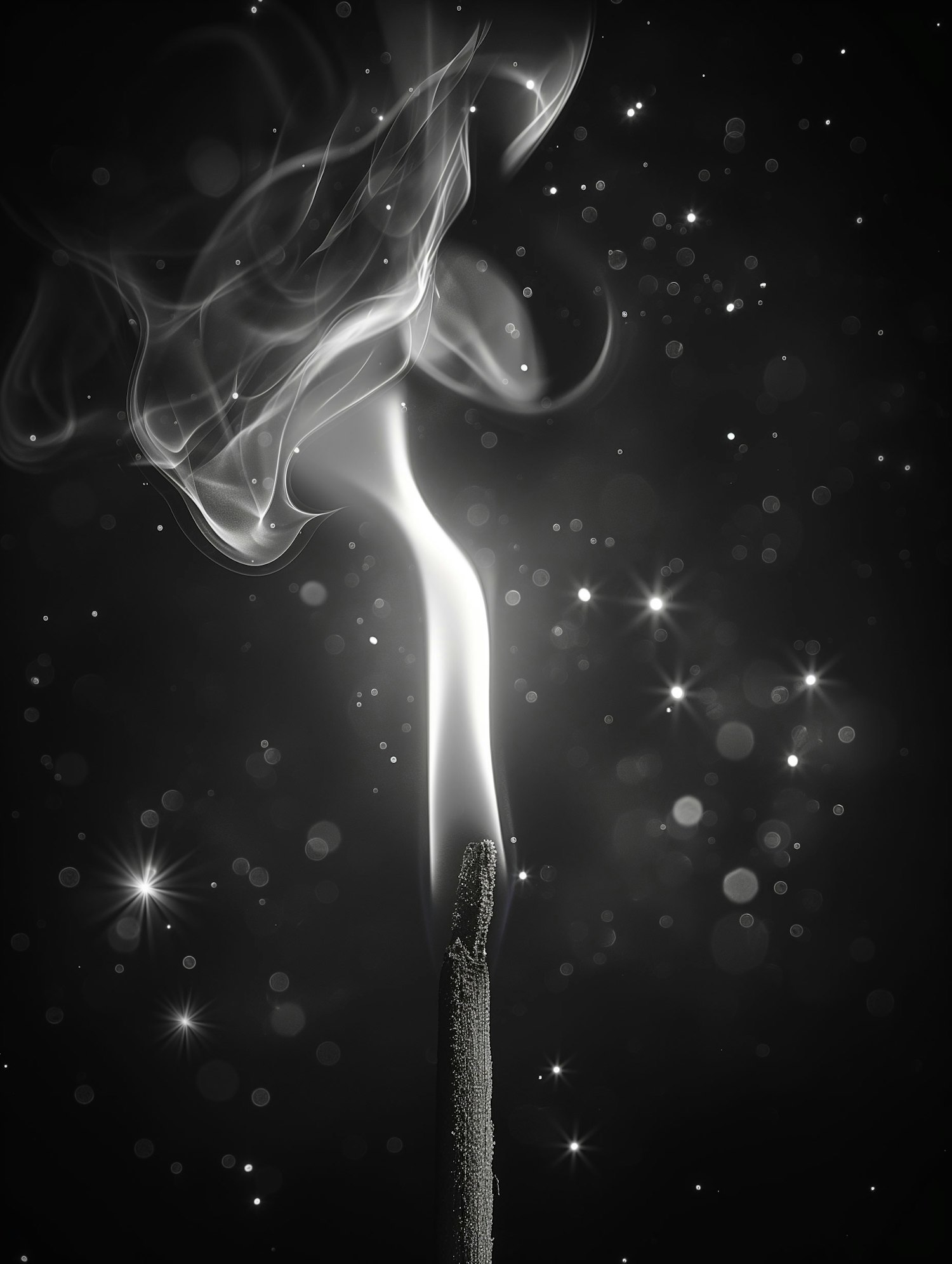 A burning incense stick with swirling smoke and sparkling particles against a dark background, creating a mystical and serene atmosphere.