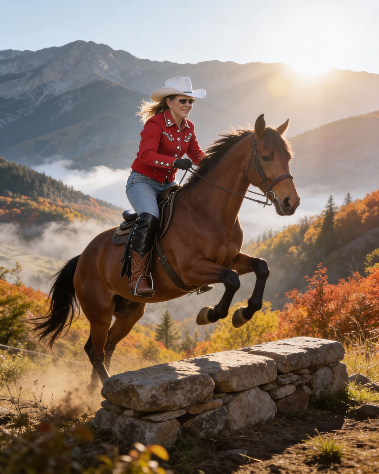 A woman in a red jacket and cowboy hat rides a horse jumping over a stone barrier, set against a scenic mountain and autumn forest backdrop.