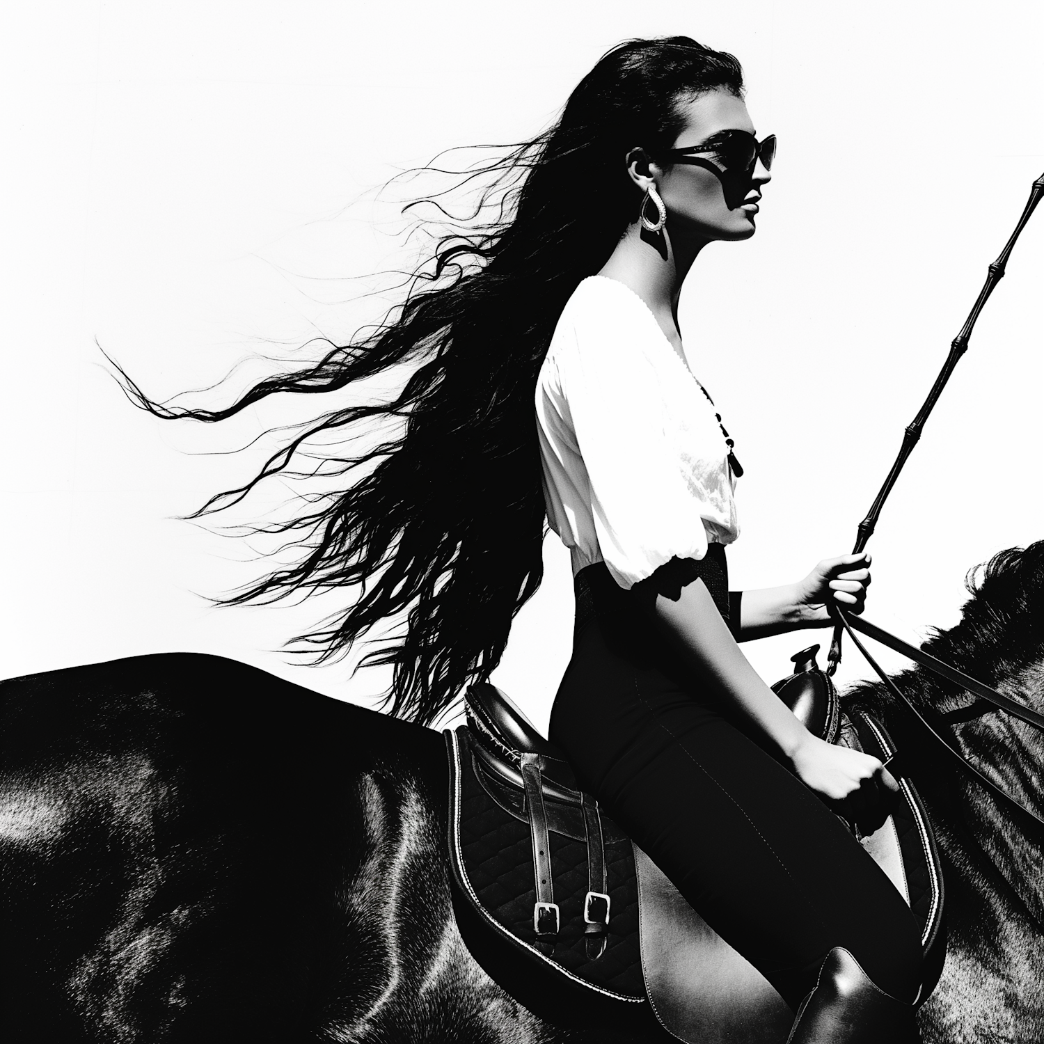 Elegant black and white image of a woman with flowing hair riding a sleek horse, exuding confidence and style.