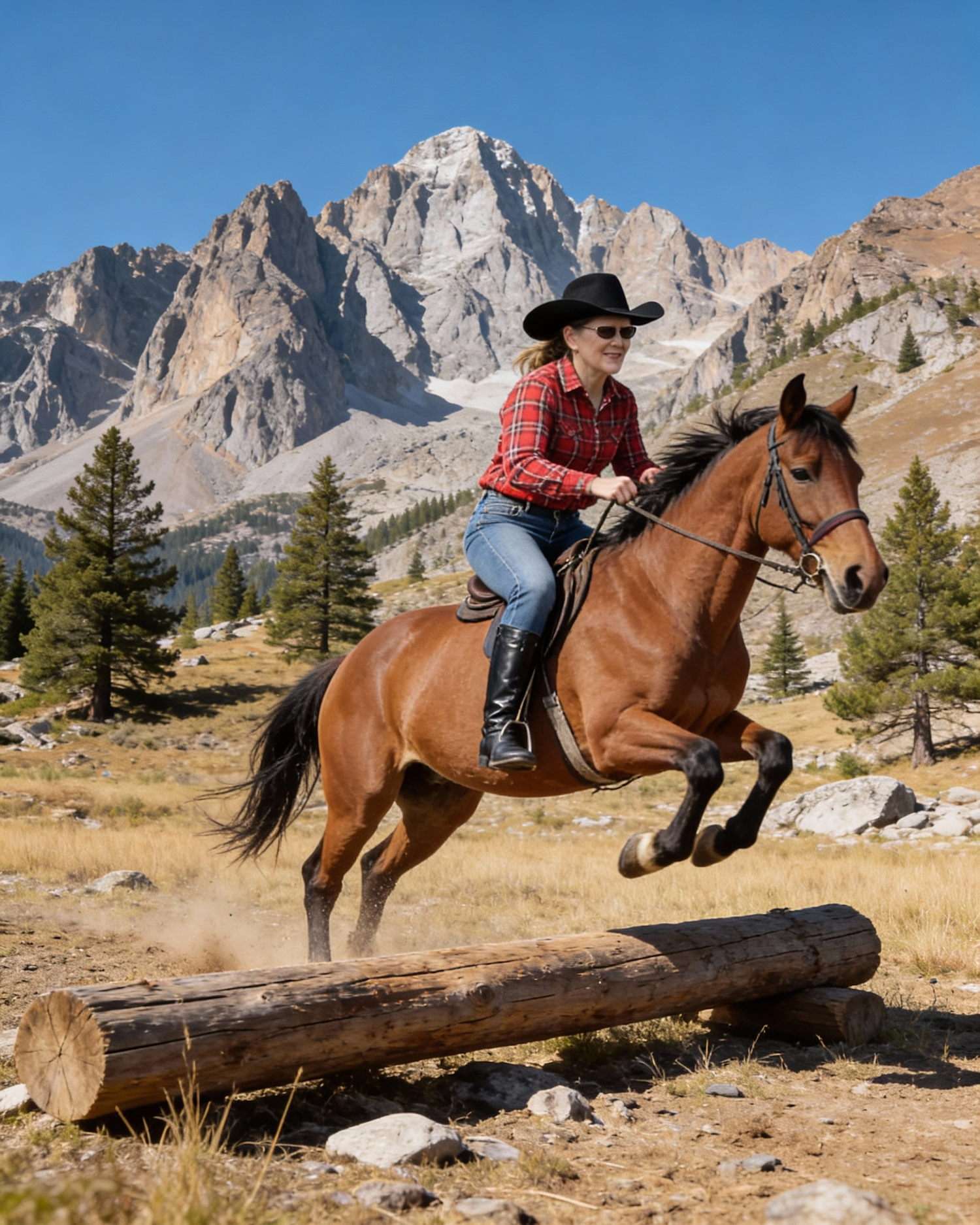 A woman riding a horse jumps over a log in a scenic mountain landscape with clear skies and rugged peaks.