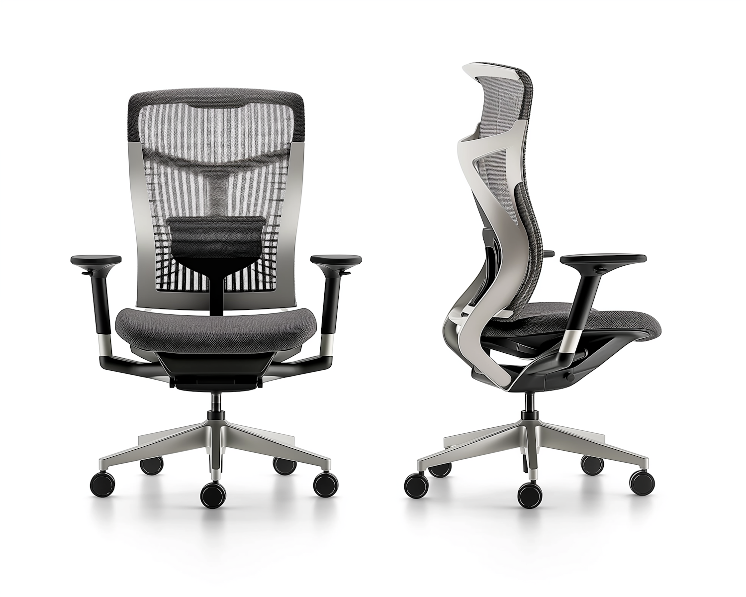 Modern ergonomic office chairs with mesh backrests and adjustable features, shown from front and side views.