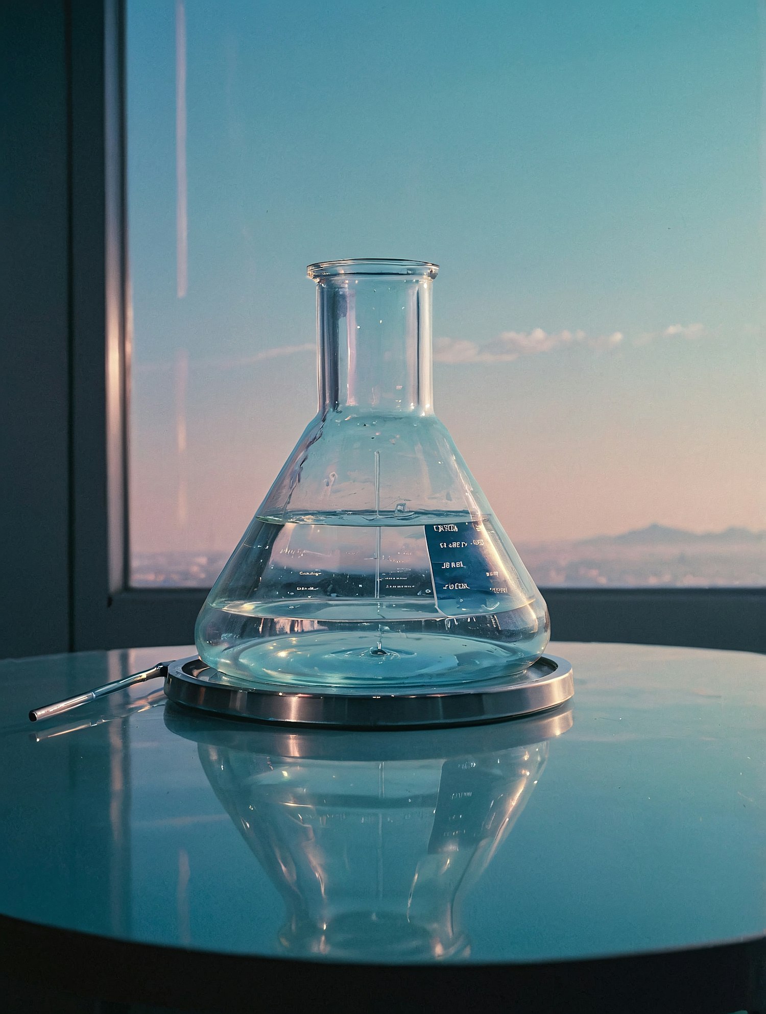 A glass Erlenmeyer flask with liquid sits on a reflective table, framed by a serene sky and mountain view through a large window.