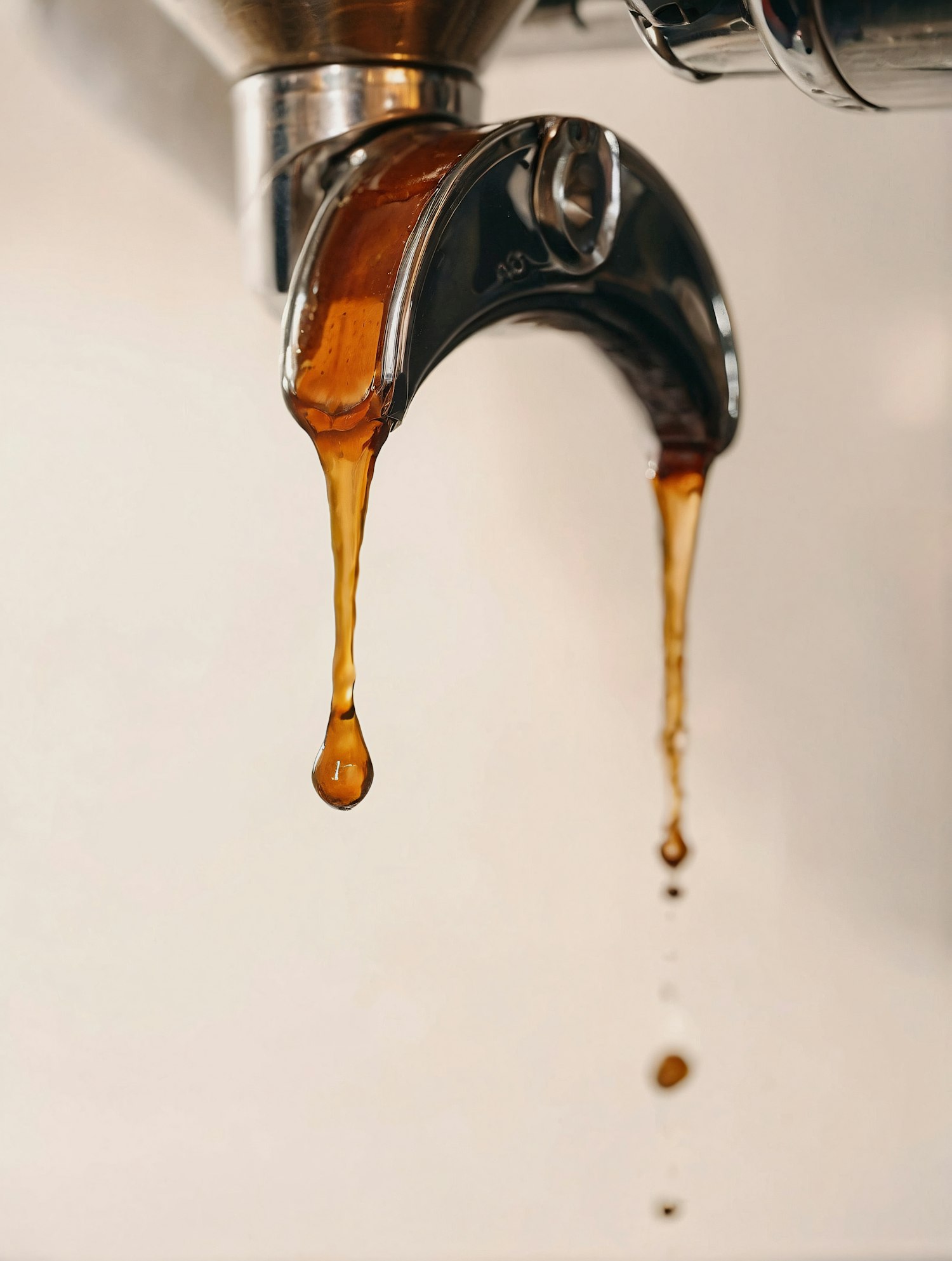 Close-up of espresso dripping from a portafilter, showcasing rich coffee texture and golden hues. Perfect for coffee lovers and barista enthusiasts.