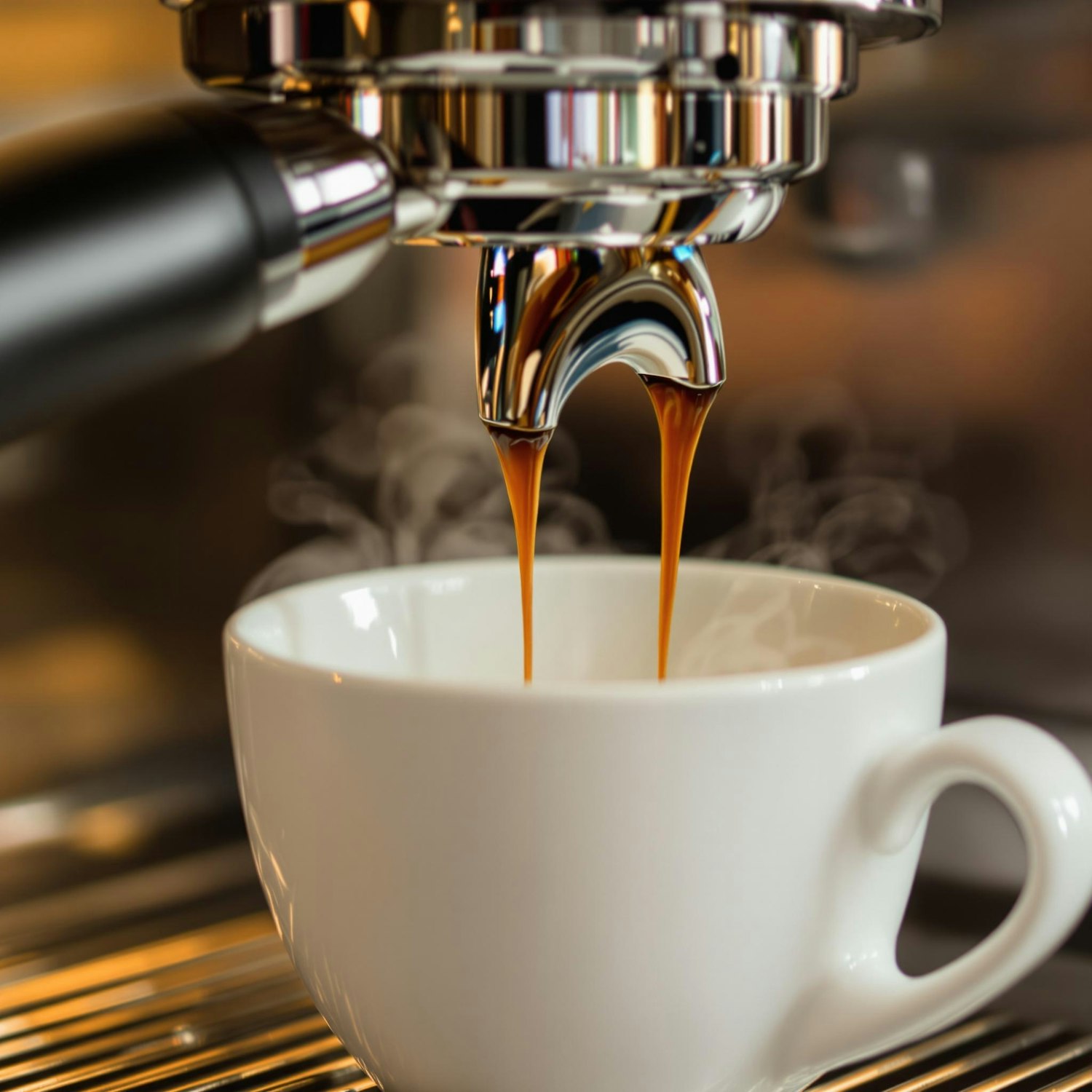 Close-up of an espresso machine pouring fresh coffee into a white cup, with steam rising and gleaming metallic details.