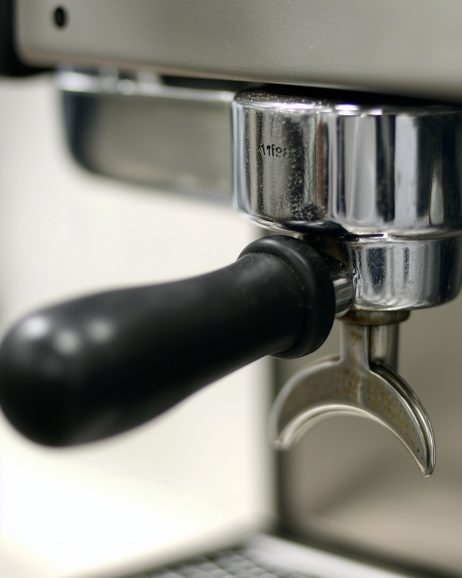 Close-up of a chrome portafilter with a black handle attached to an espresso machine, highlighting its polished finish and coffee stains.