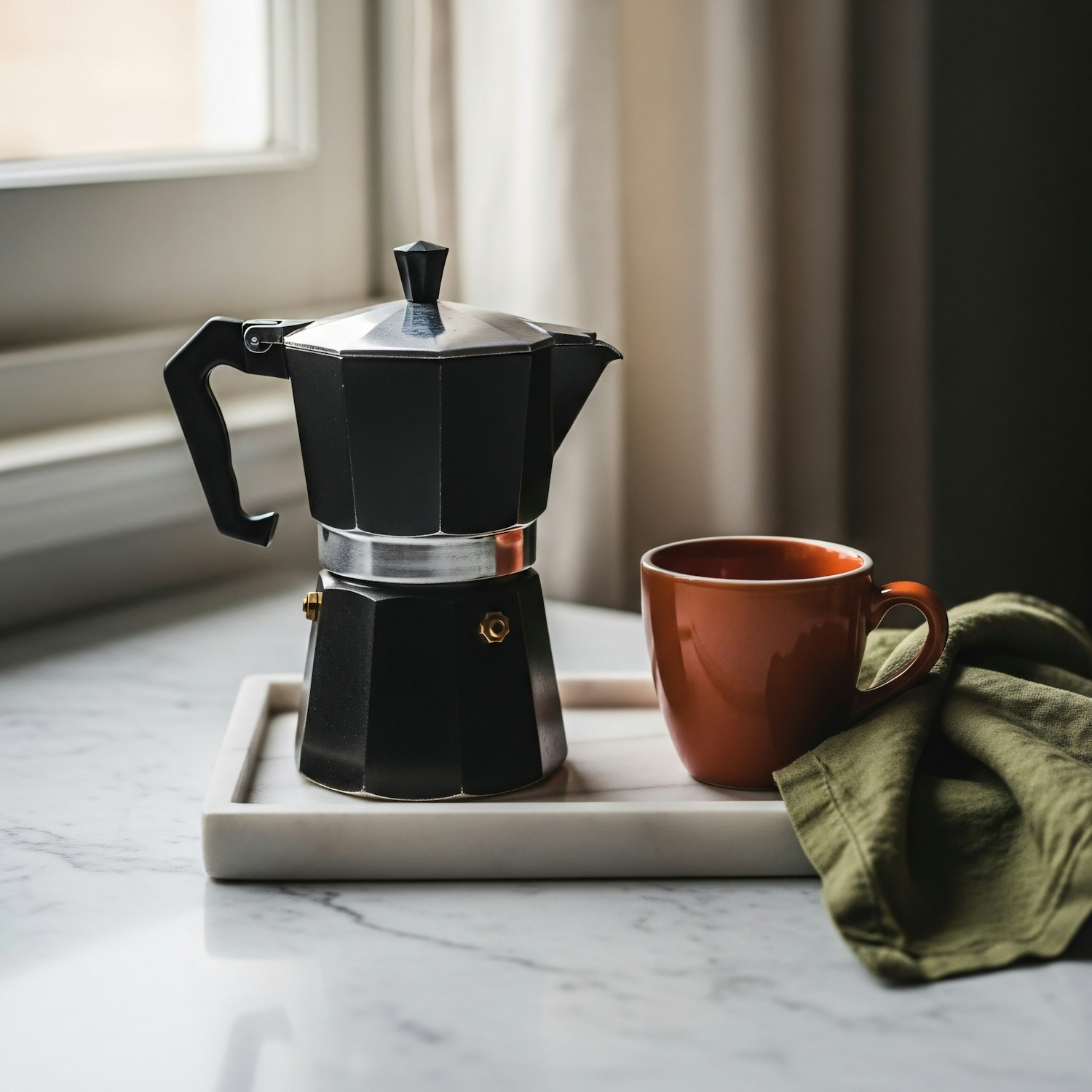 A black stovetop espresso maker with a brown coffee cup and green napkin on a marble tray, set on a bright kitchen counter.