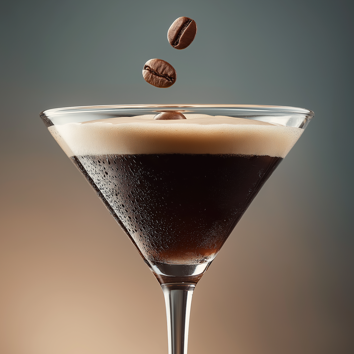A frosty espresso martini with creamy foam, topped with falling coffee beans, set against a warm, blurred background.