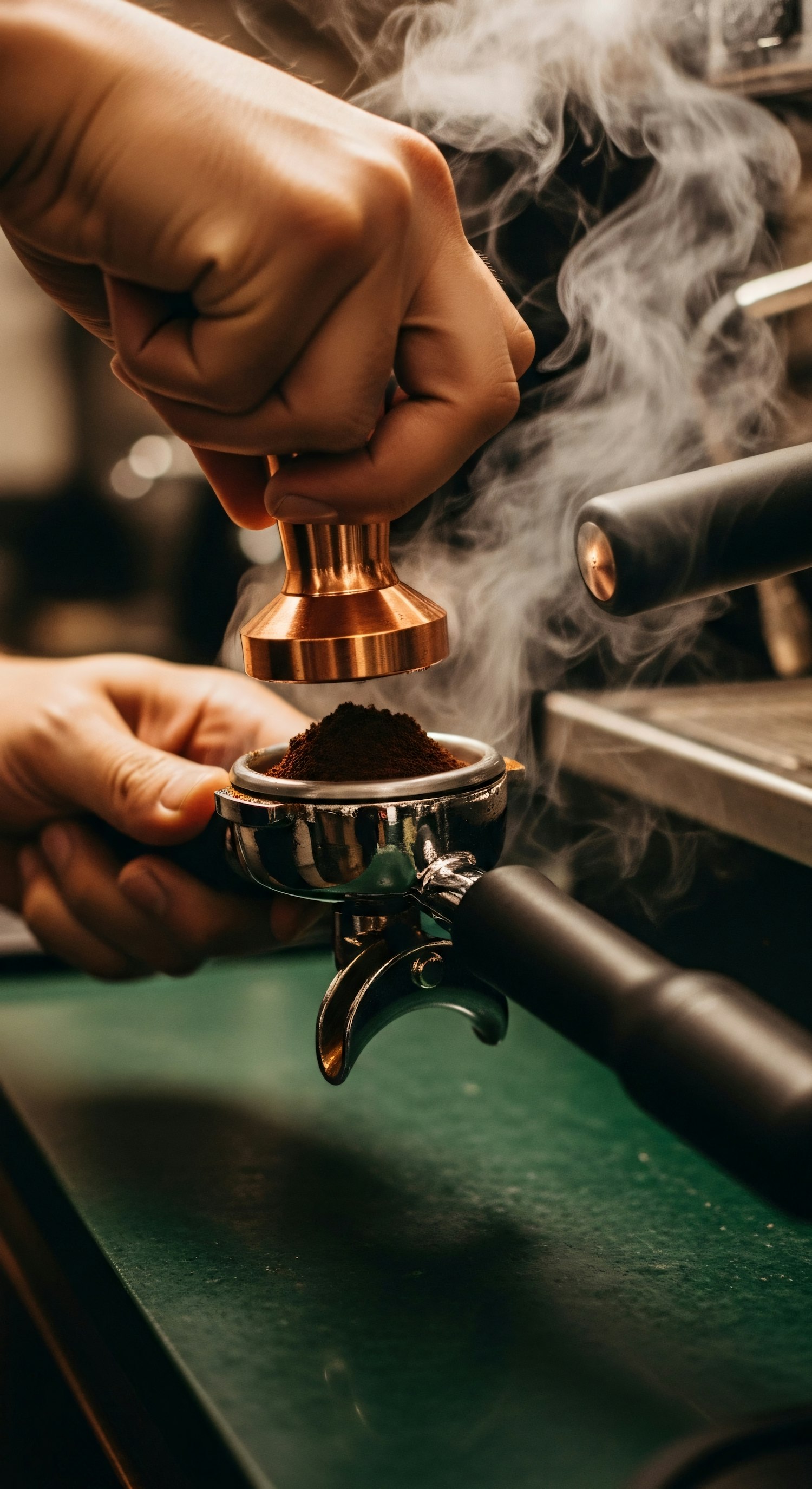 Close-up of a barista tamping coffee grounds into a portafilter, with steam rising in a cozy coffee shop setting.
