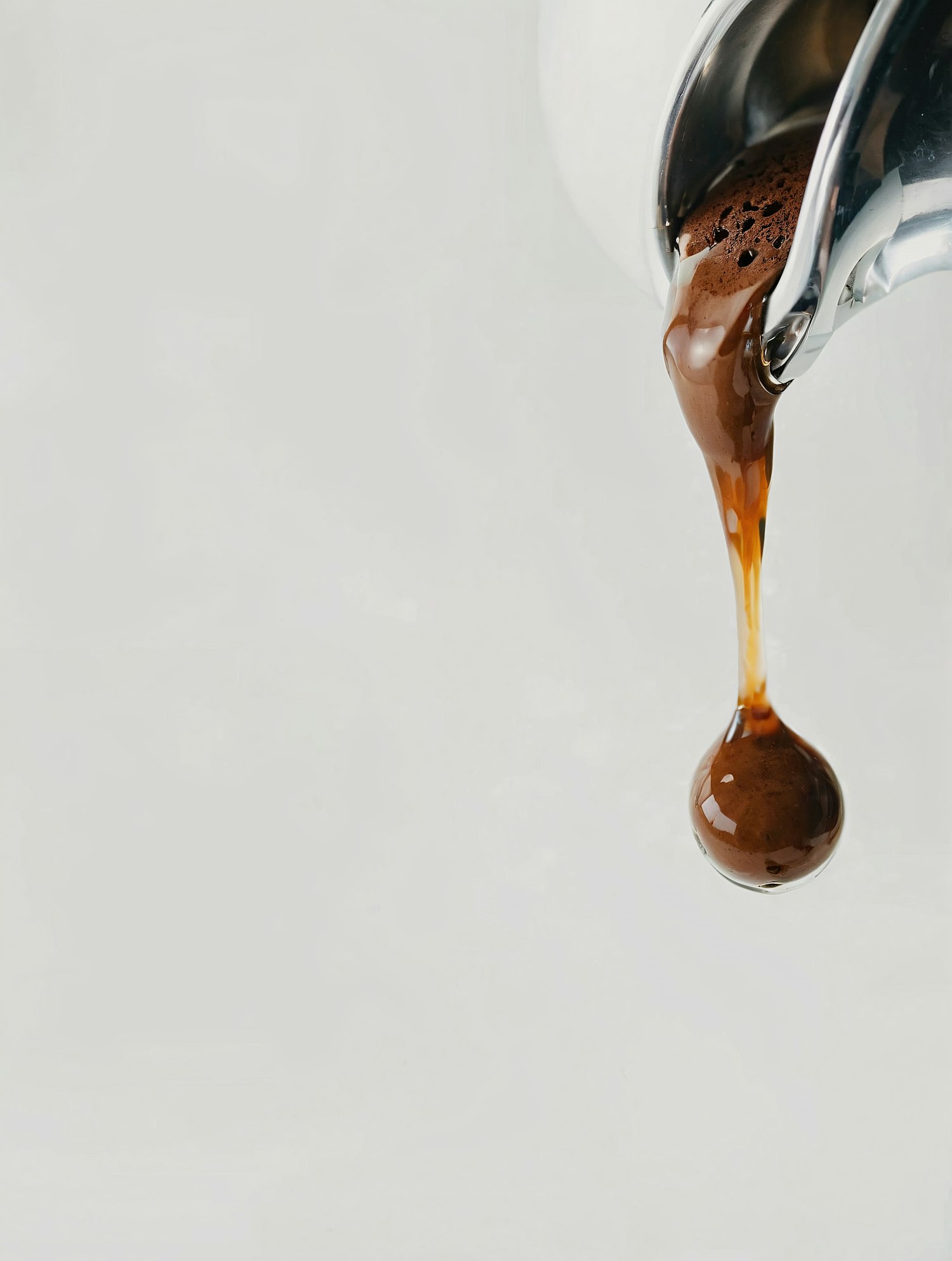 Close-up of espresso dripping from a coffee machine spout, highlighting the rich crema and glossy texture against a minimal background.