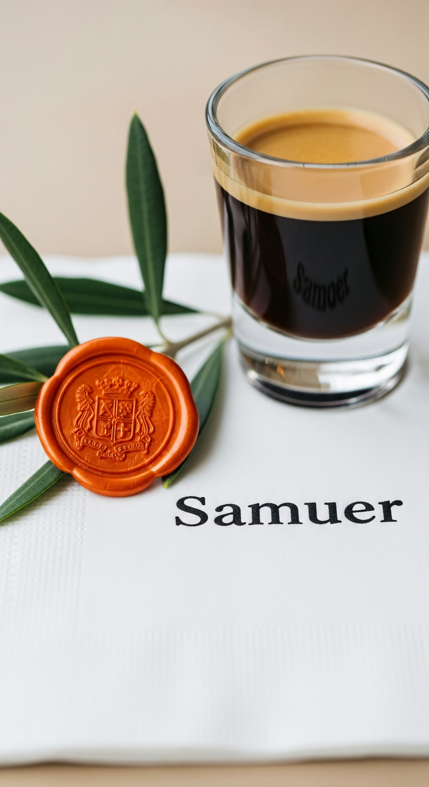 Elegant espresso shot with a wax seal and green leaves on a personalized napkin, perfect for a refined coffee moment.