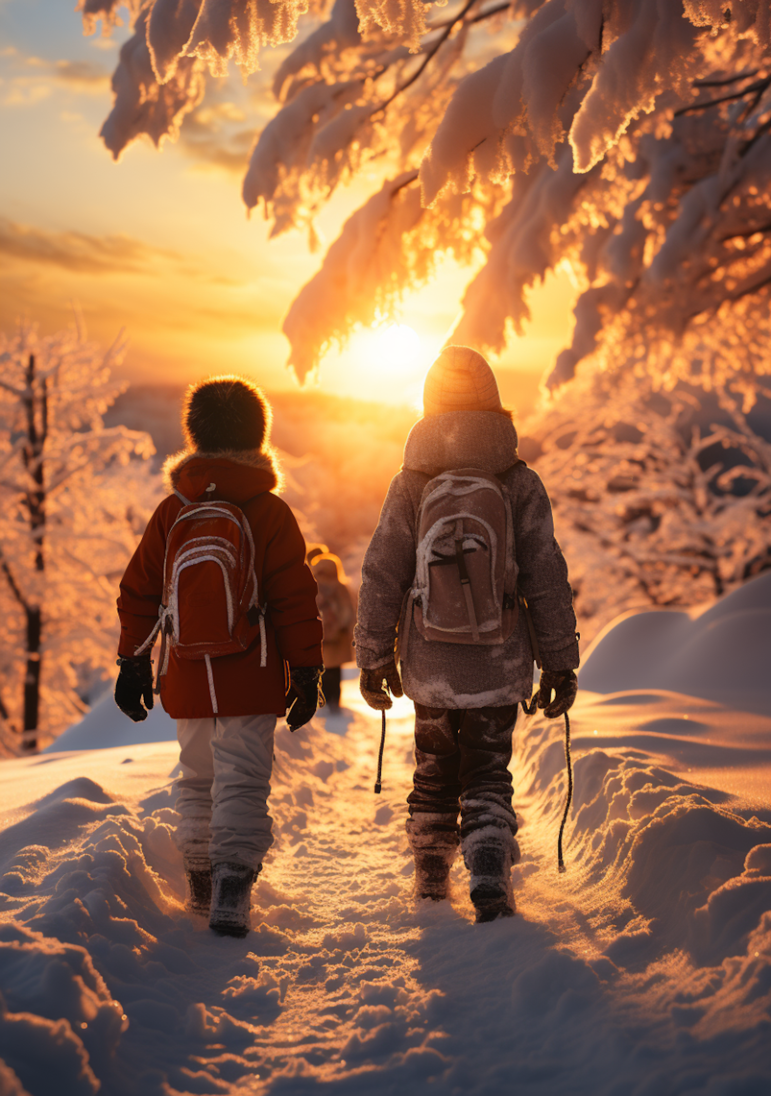 Two children walk through a snowy landscape at sunset, wearing winter coats and backpacks, with snow-covered trees and a golden sky.