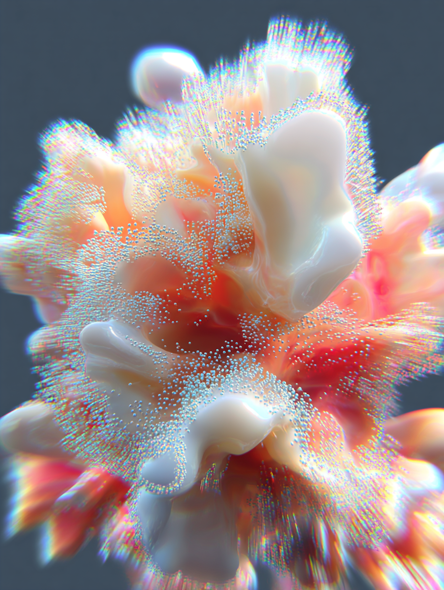A stunning 3D abstract design with flowing organic shapes in warm tones and shimmering particles on a neutral background.