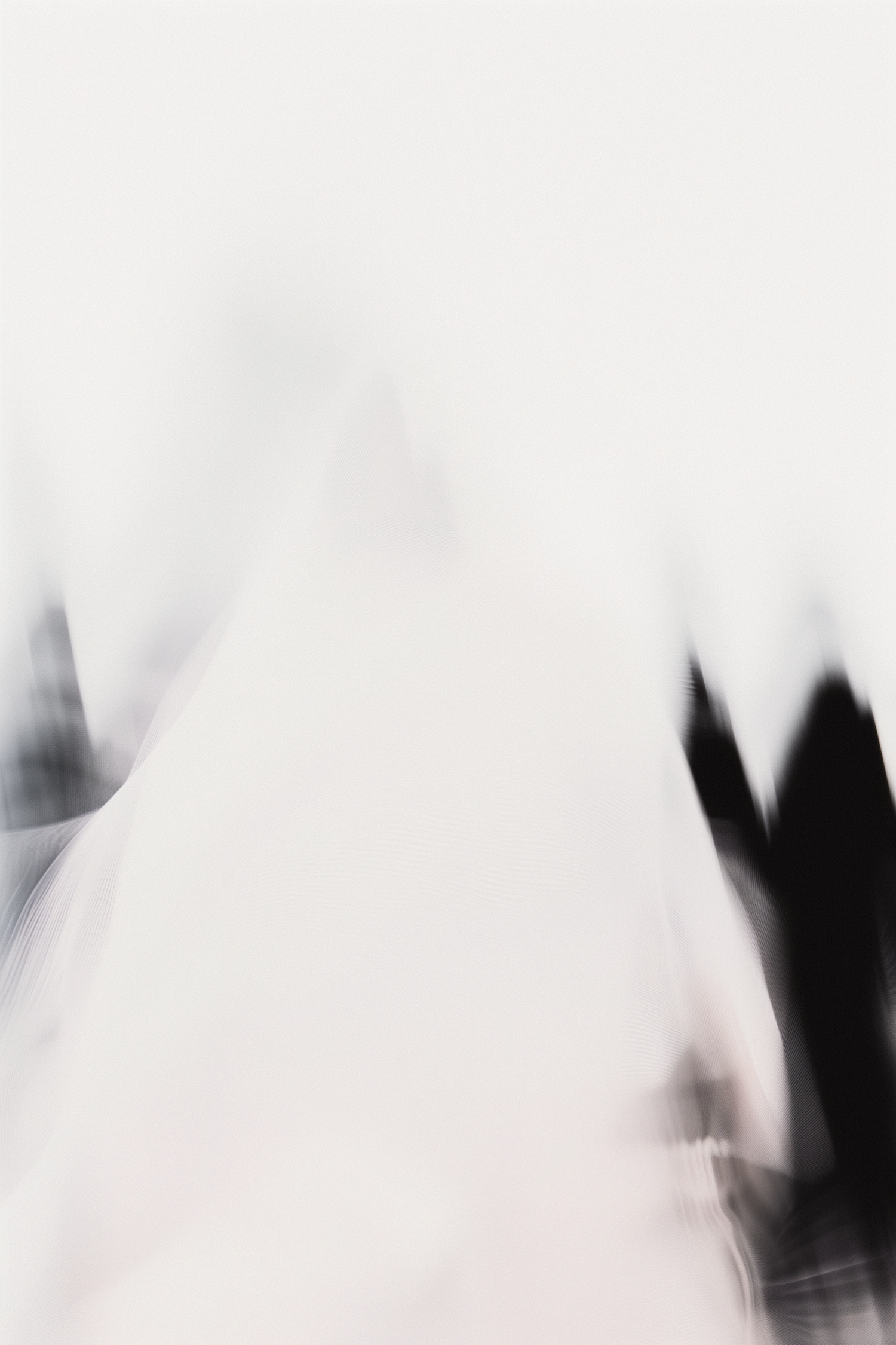 Abstract image with soft white tones and dark shadowy shapes, creating a dreamy, minimalist aesthetic with a sense of movement.