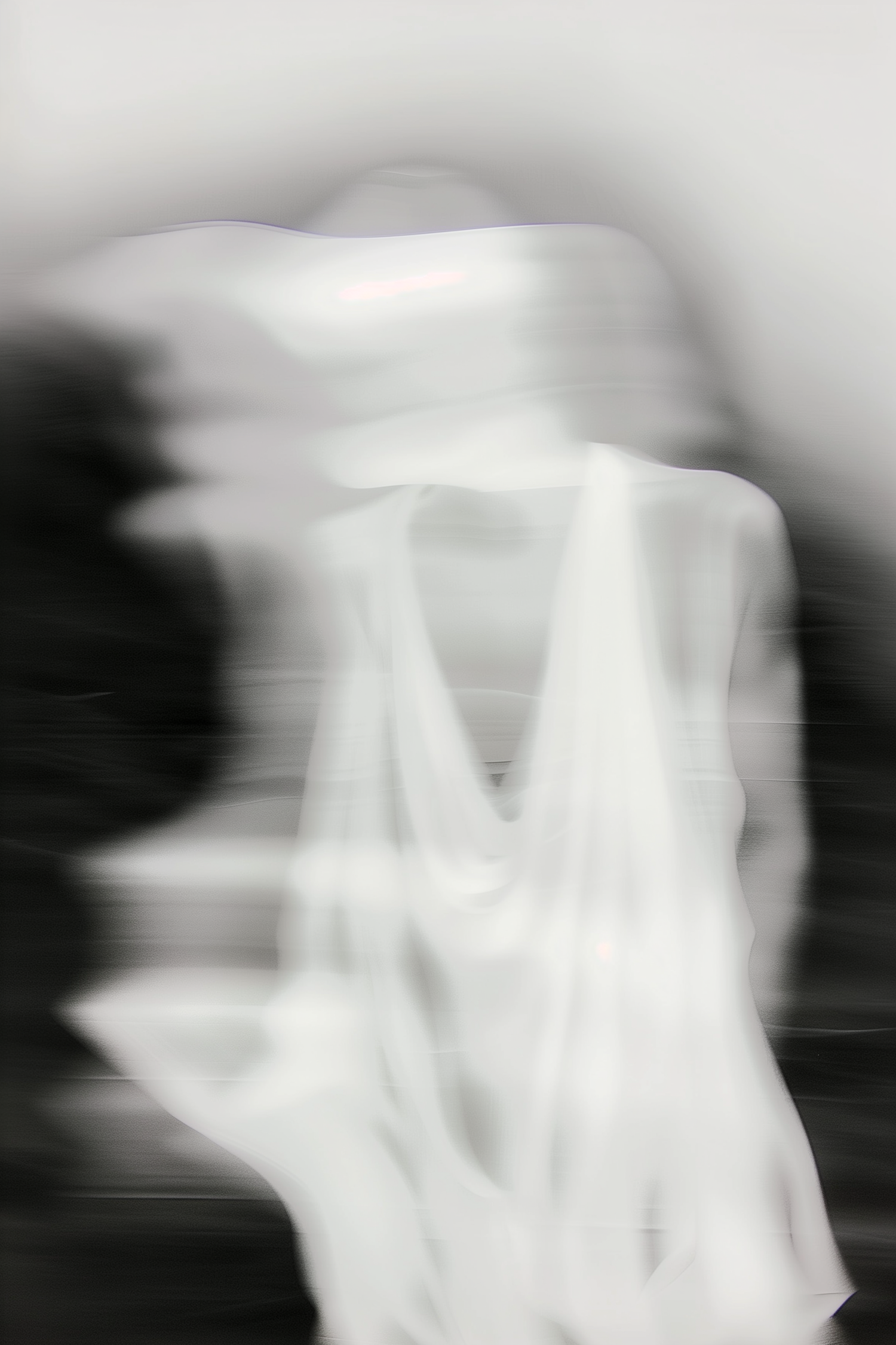 Abstract blurred figure in white flowing garment, creating a ghostly, dreamlike effect with muted tones and a surreal atmosphere.