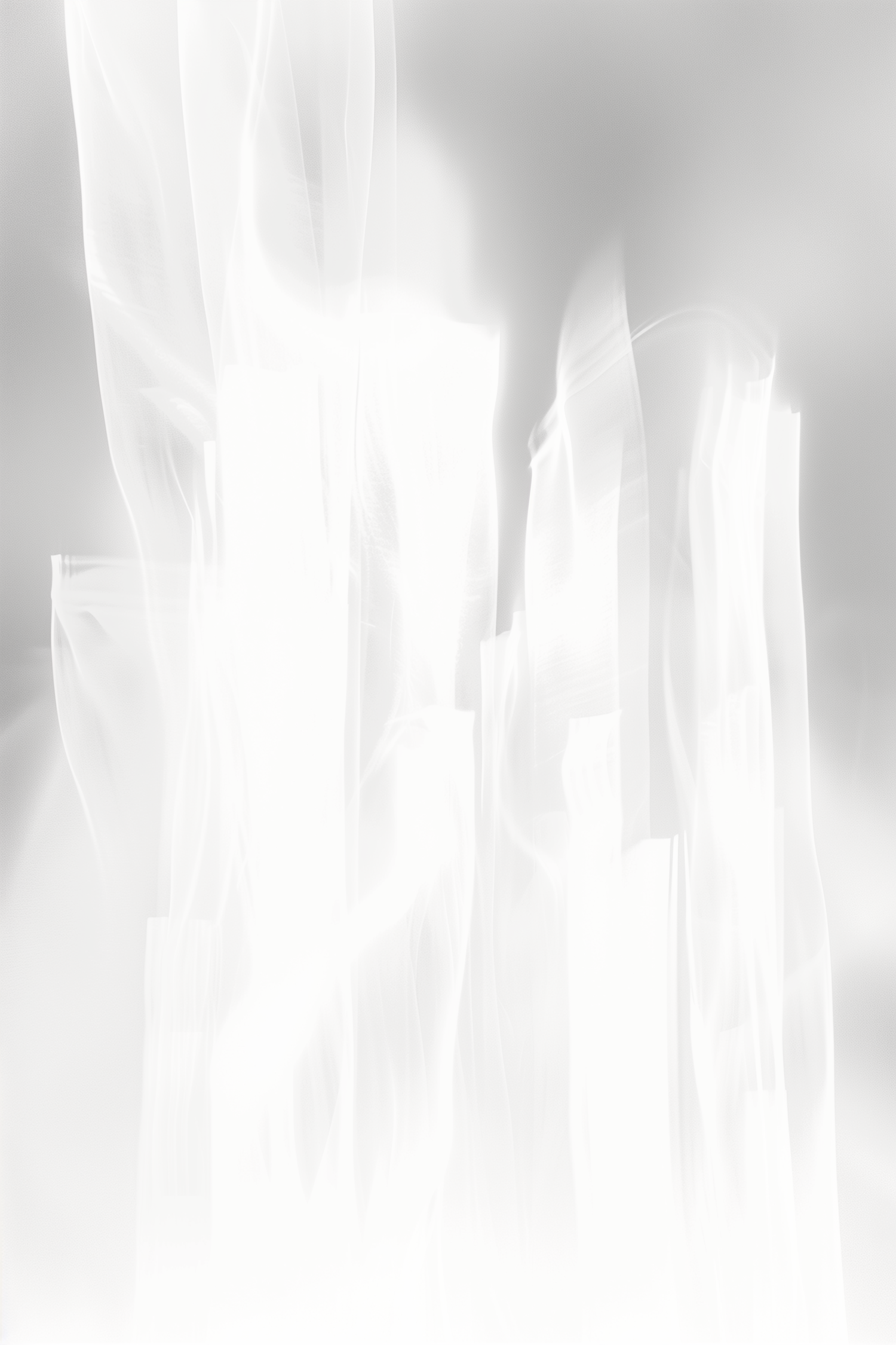 Abstract white flowing shapes resembling fabric or smoke on a soft gray background, creating a serene and ethereal atmosphere.