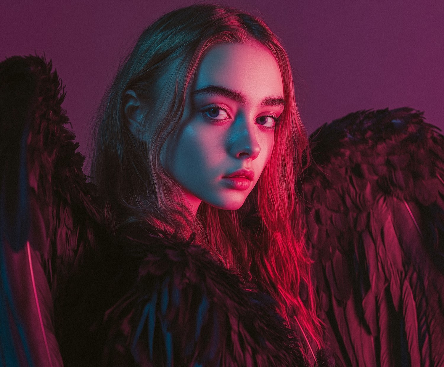 Ethereal portrait of a young woman with black wings, illuminated by pink and blue lighting, creating a mystical atmosphere.