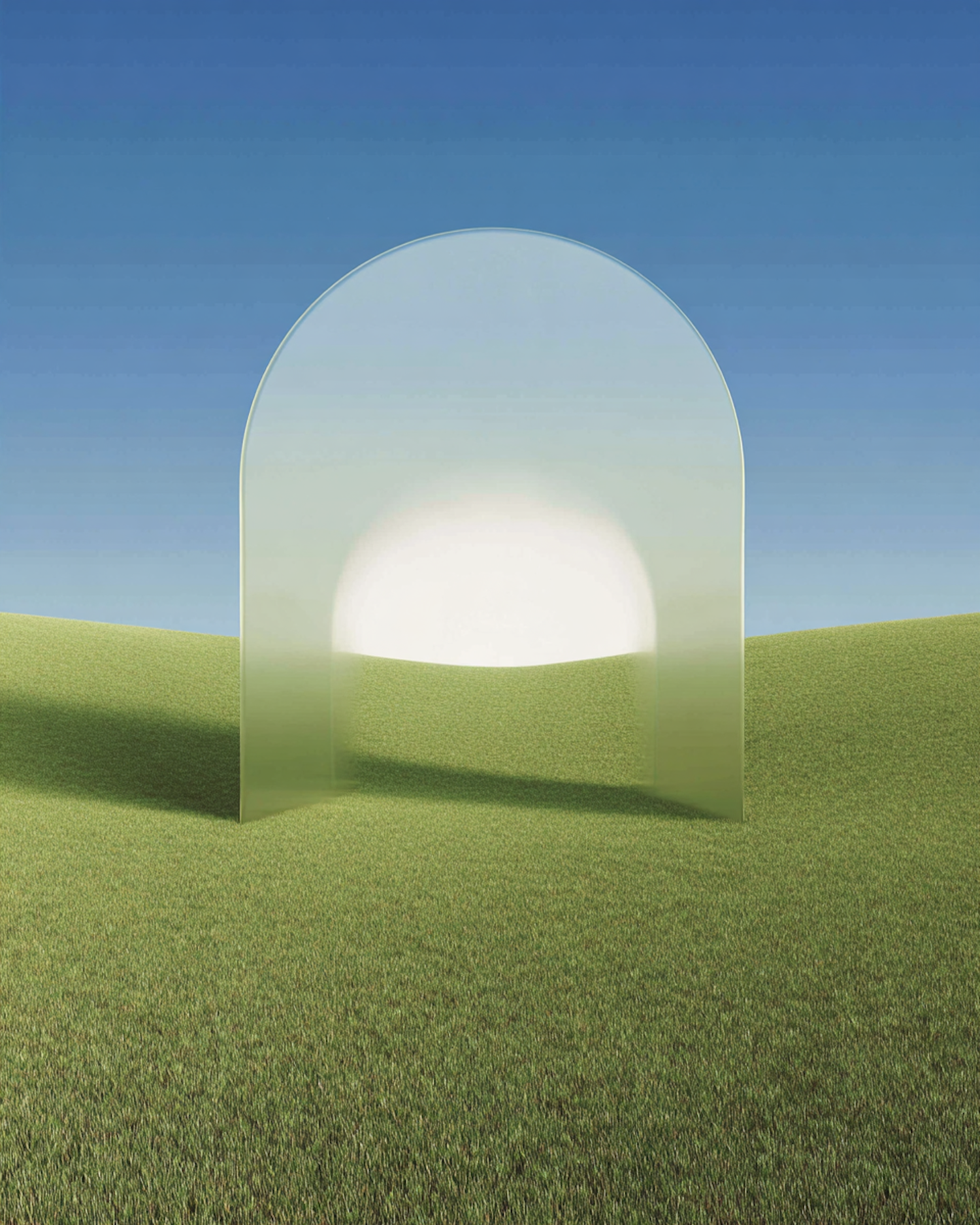 A translucent arch stands in a grassy field under a clear blue sky, blending seamlessly with the serene natural surroundings.
