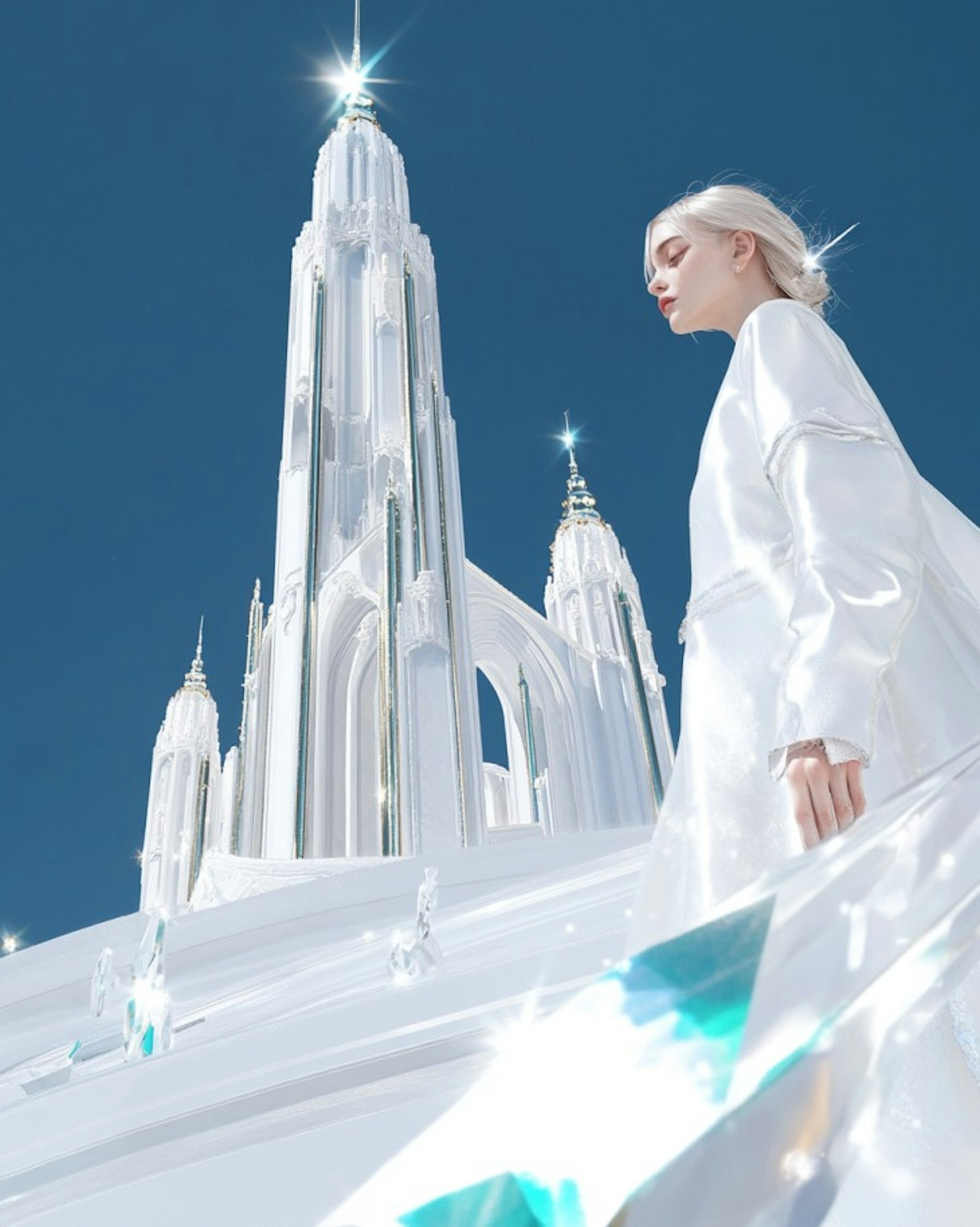 Ethereal scene with a crystalline castle and a person in white, under a clear blue sky, creating a dreamlike atmosphere.