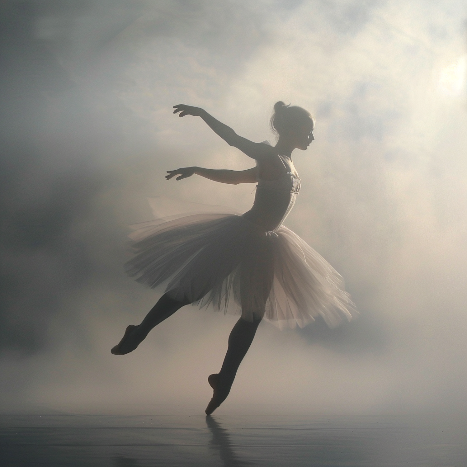 A ballerina in a white tutu leaps gracefully in a misty, ethereal setting, creating a dreamlike and elegant scene.