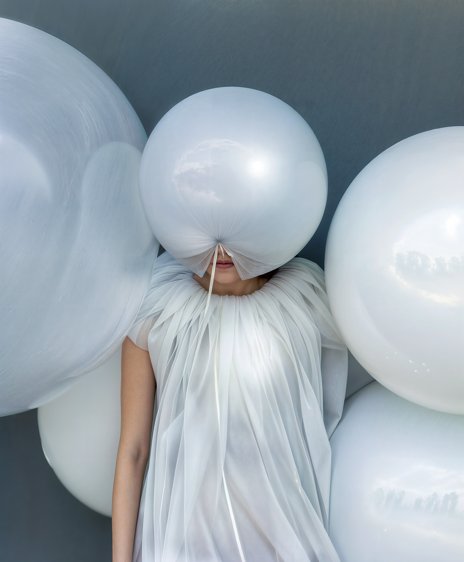Surreal image of a person obscured by large white balloons, wearing a flowing white garment against a muted gray background.