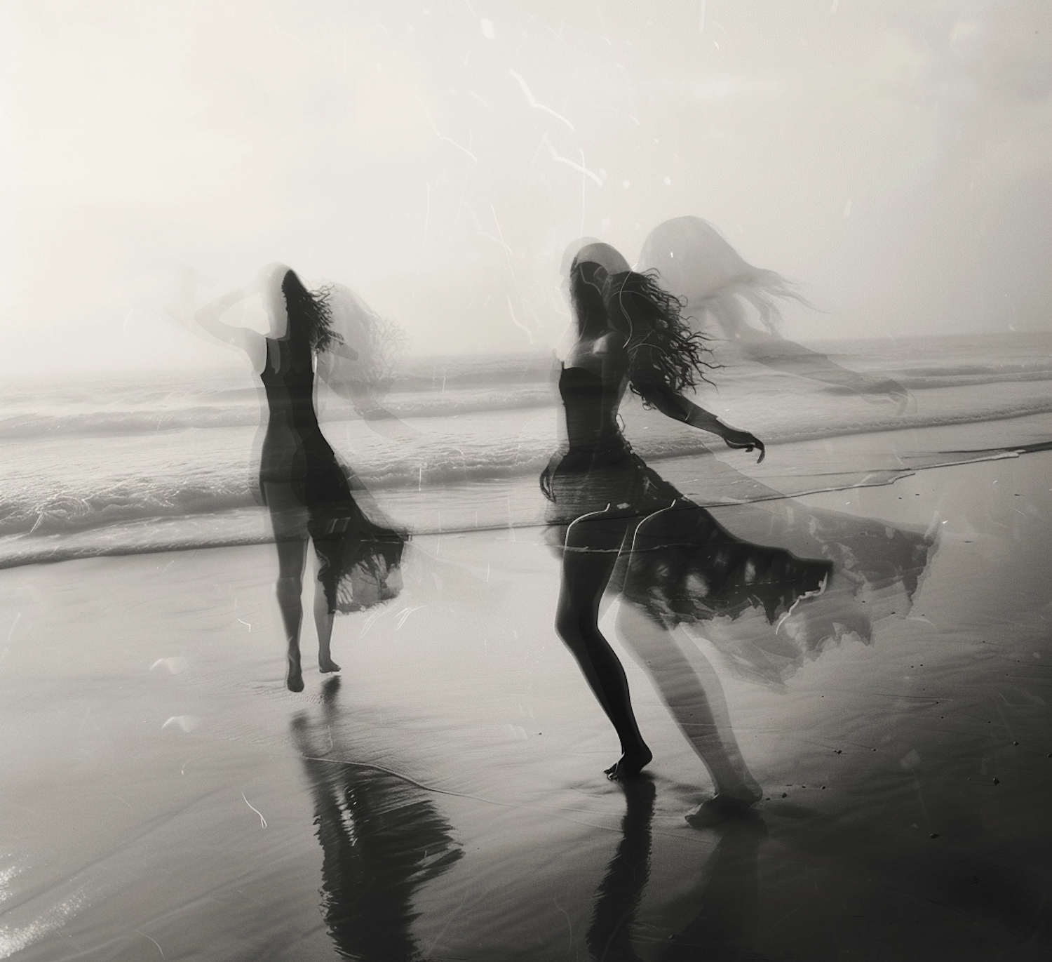 Ethereal black and white image of a woman dancing on a beach, with blurred motion creating a ghostly, dreamlike effect.